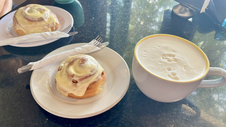 - ogromna kava, ogromen čaj in ogromni cimetovi rolici = 305 MXN (15,60 EUR)