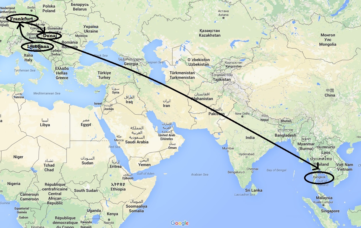 Končno je napočil tako pričakovani čas za odhod. V petek zvečer sem imela najprej z Adrio let iz Ljubljane v Frankfurt in nato naprej v Doho ter Bangkok. Po planu bi morala prispeti v Bangkok v soboto popoldan ob 13h po njihovem času. A se je že na začetku močno zalomilo. Adria je zamujala že s prvim letom v Frankfurt, zaradi zasedenosti zračnega prometa v Frankfurtu.