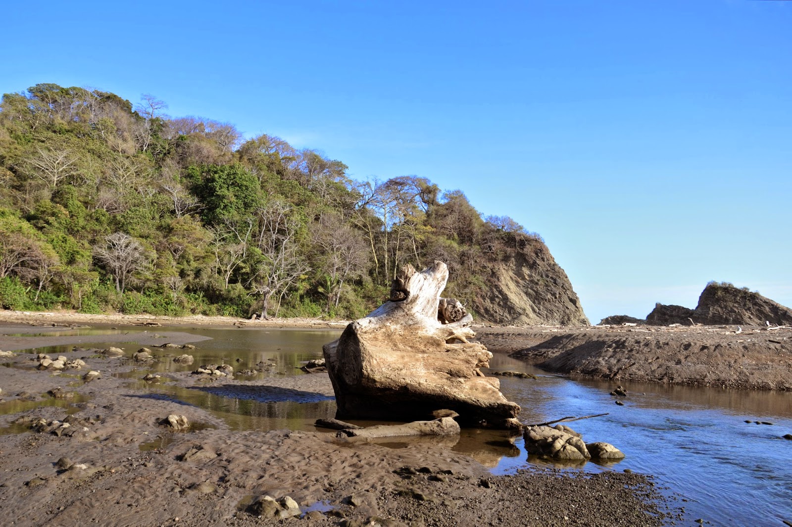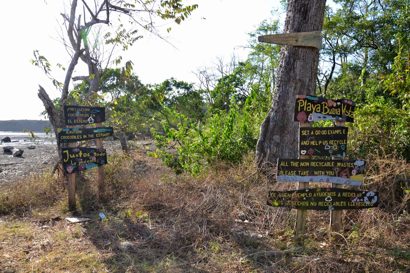 Popoldansko kopanje sva si želela preživeti na sosednji plaži, zato sva se s kolesi napotila v drugo smer – severno od Playe Samare. Playa Samara ima takšno lego, da sonce precej hitro izgine za hrib in ni viden sončni zahod, zato sva si želela na to sosednjo plažo, kjer so menda res lepi sončni zahodi. Po 10 minutah kolesarjenja po makadamski cesti prispeva do plaže, kjer pa naju ustavijo napisi – pazite, krokodili v reki. OMG!