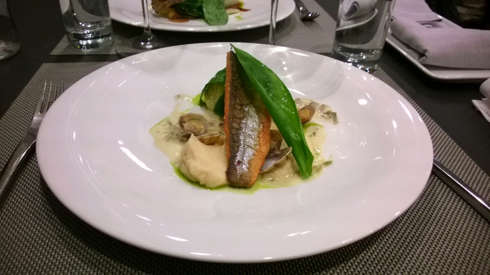 | Brancinovi cmočki – cmočki iz svežega brancina s hrustljavim brancinovim filejem, dušenimi vongolami in omako iz sivega pinoja Vander, Ljubljana |