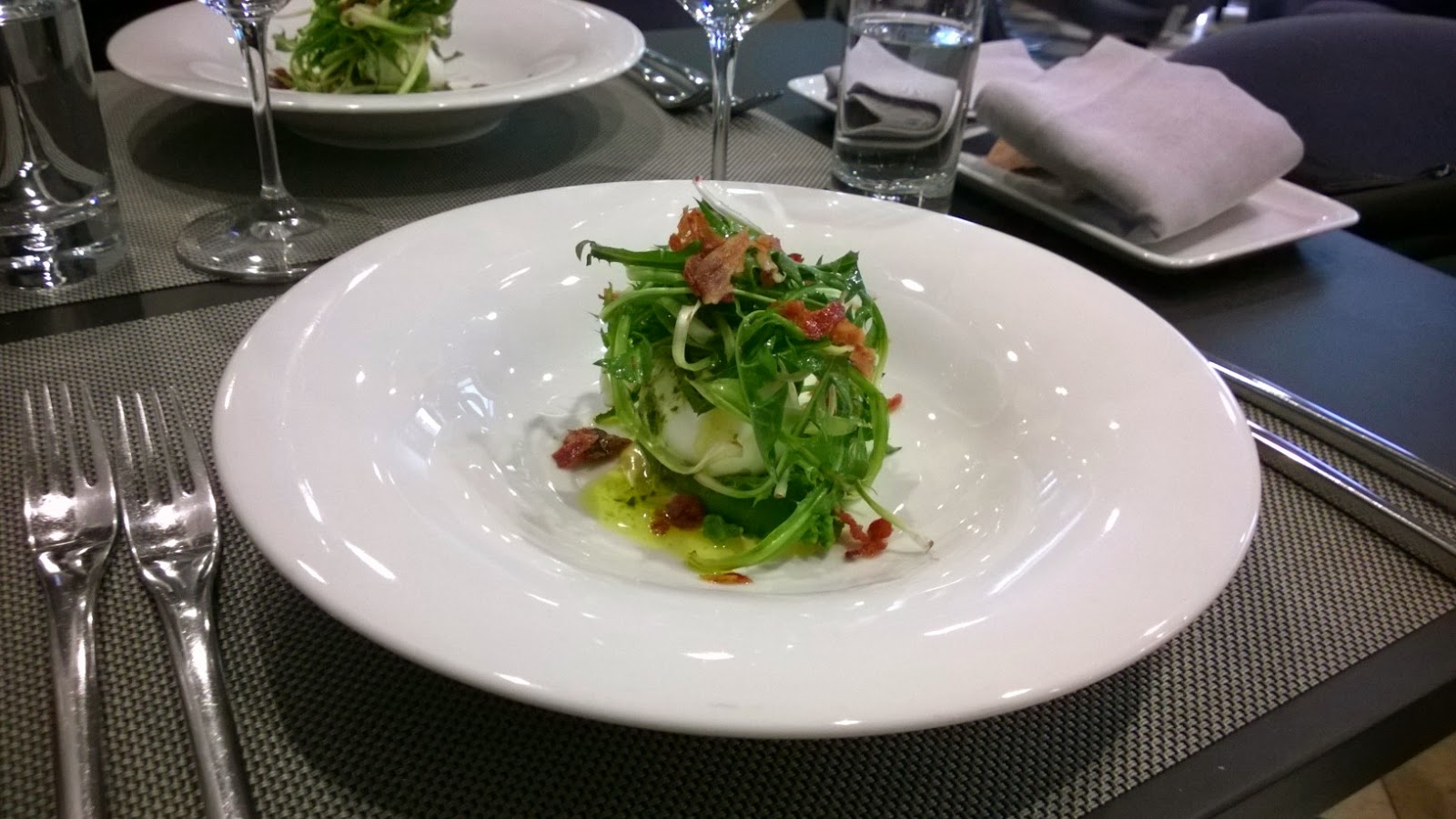 | Regrat v solati – mehko kuhano jajce na domačem krompirju s pestom iz regrata, kremo iz pancete, regratovimi listi in popečeno hrustljavo pinceto Vander, Ljubljana |