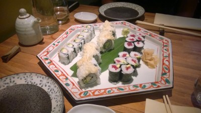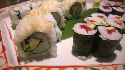| Pladenj zvitkov z rakci, tuno in avokadom Sushimama, Ljubljana, Slovenija |