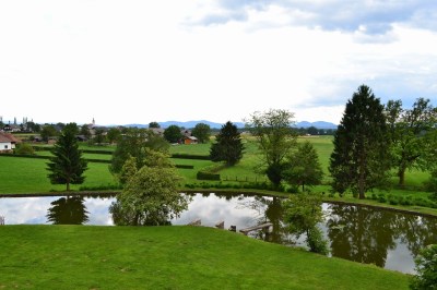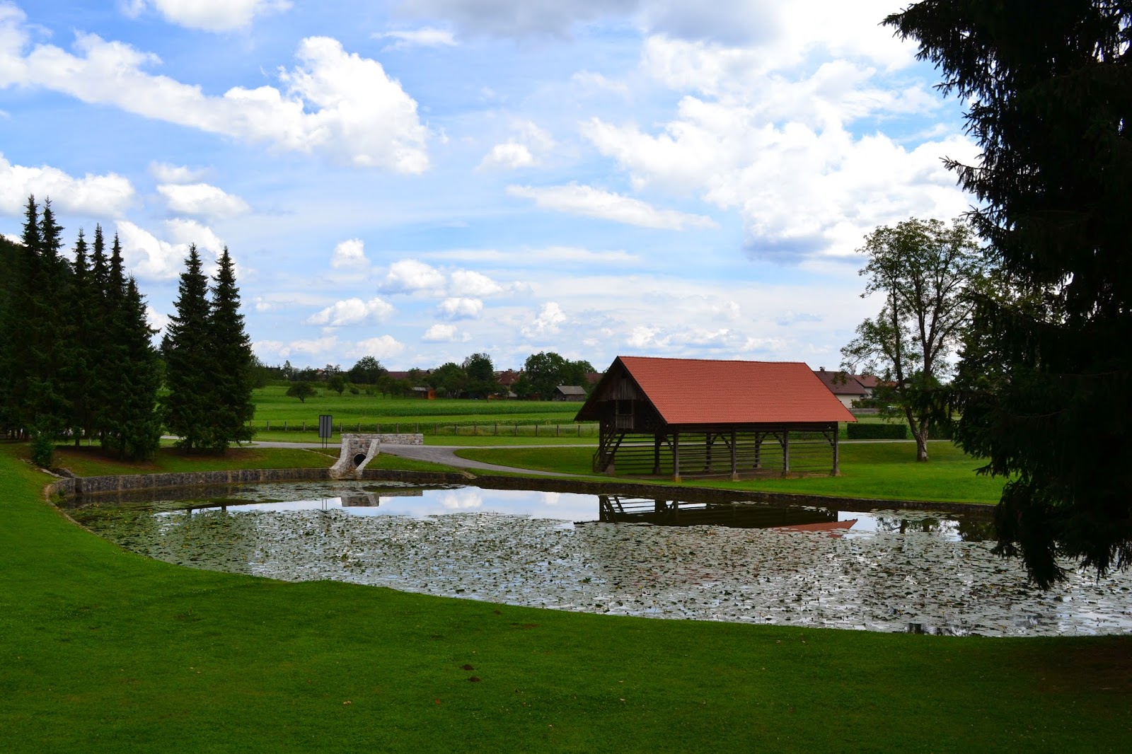 | Brezhibno urejena okolica gradu z ribnikom in kozolcem. Grad Strmol, Slovenija |