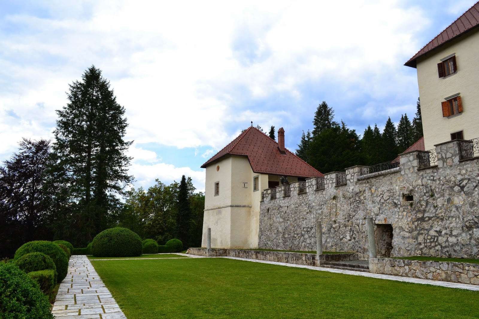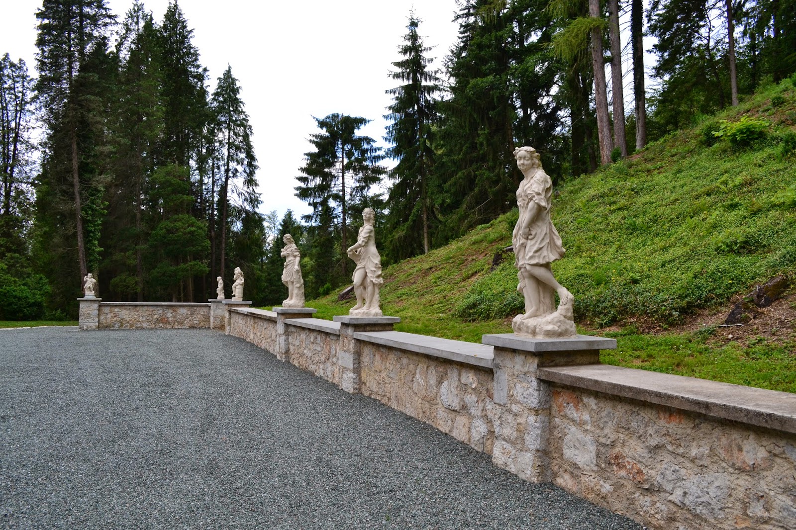 | Pred gradom je dvorišče, ki ga krasijo ženske figurice. Grad Strmol, Slovenija |