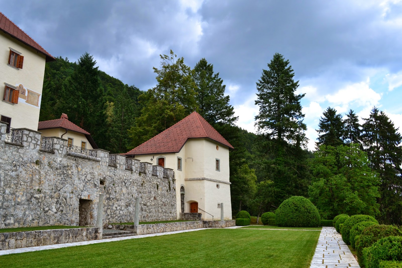 | Krasno dvorišče na spodnji strani gradu z lepim pogledom. Grad Strmol, Slovenija |