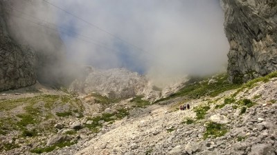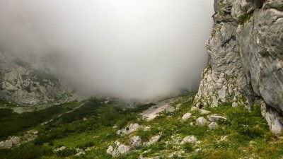 | Poglede v dolino in na vrh nama je zastirala gosta megla. Kokrsko sedlo, Slovenija |
