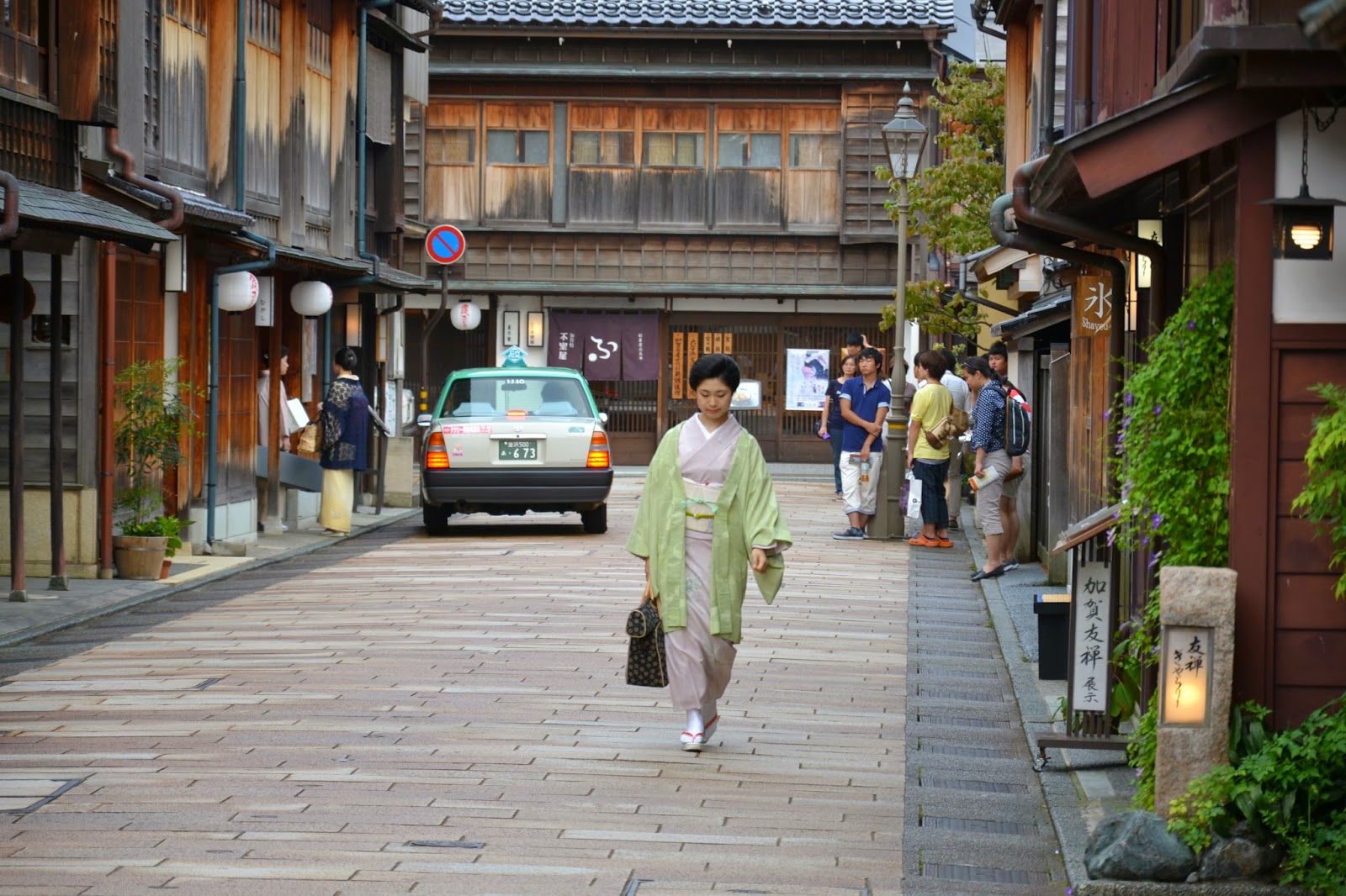 Če si dovolj vztrajen ali celo obiščeš kraj proti večeru, lahko vidiš gejšo. Midva sva eno celo uspela videti, ki je verjetno odhajala s popoldanske vaje (?), saj ni bila naličena. Se pa zelo hitro izmuznejo fotografskim objektivom. Največrat v taksi, ki jih čaka kar pred vrati (v ozadju).