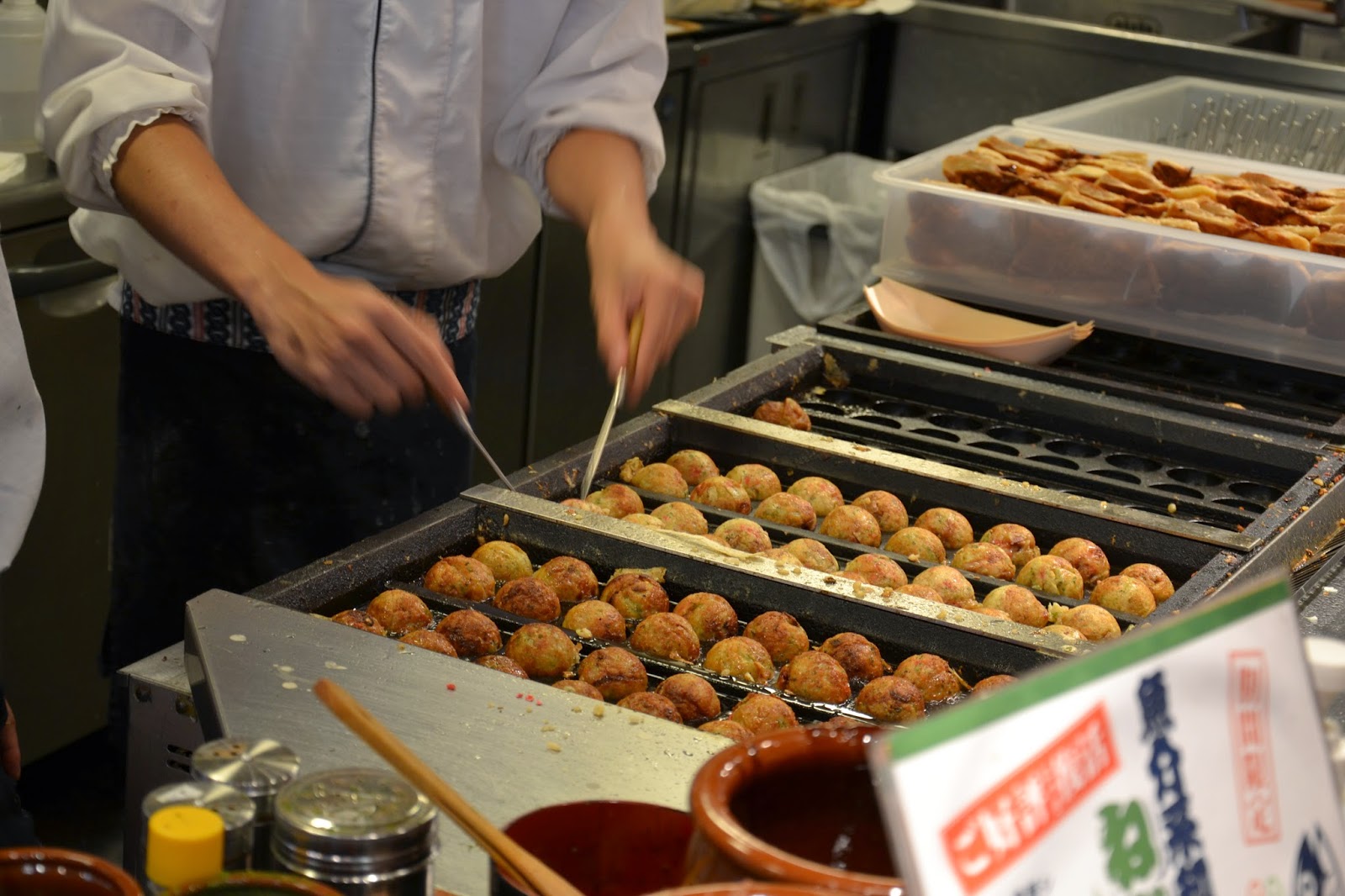 Po vrtnitvi nazaj v Tokyo sva imela pravo raziskovalno nalogo, saj sva si zaželela TAKOYAKI. Tradicionalno jed – pečeno kroglo iz testa, v kateri je nekaj zelenjave (korenček in še nekaj) ter kos hobotnice. Vse skupaj popečejo na vroči plošči (poseben model) in na koncu postrežejo z želenim prelivom in naribanim sirom. Oh, kako zelo dobro!