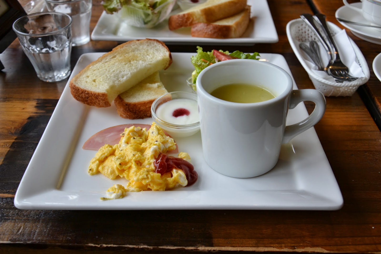 Zelenjavna juha, solata, umešana jajca, toast, šunka, jogurt.