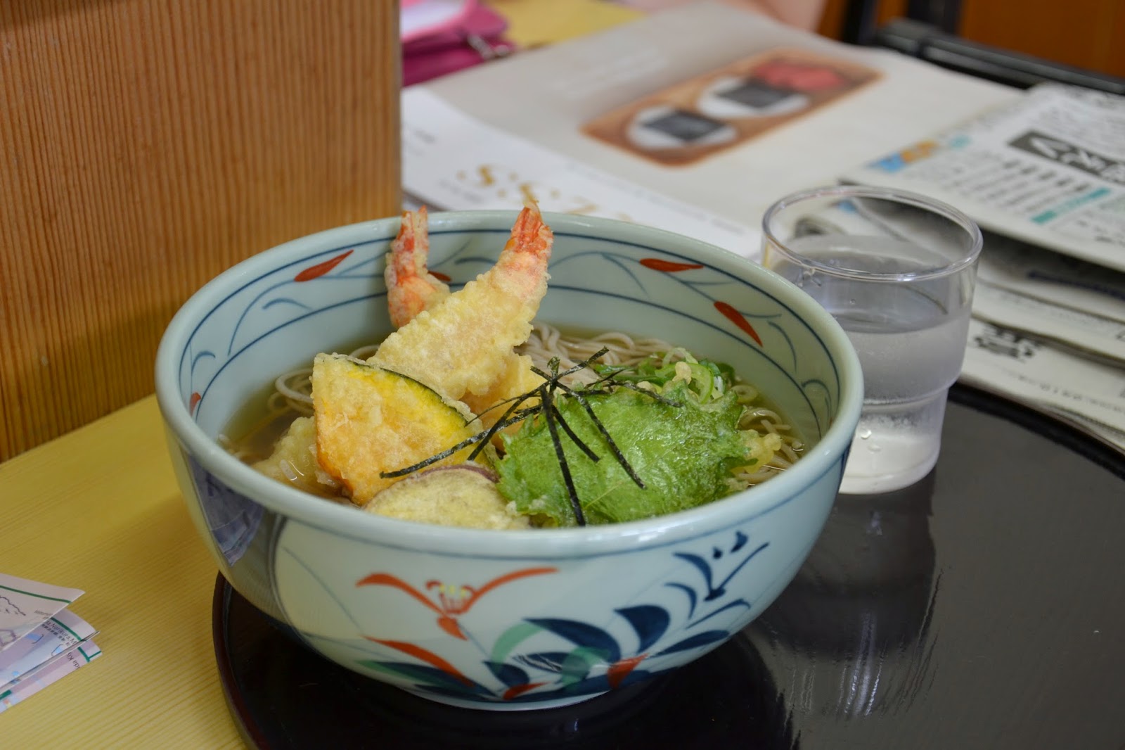 Tempura soba – juha z rezanci, ocvrtimi škampi in zelenjavo.
