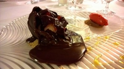| Čokoladna krogla Jagodni sorbet Vila Podvin, Radovljica, Slovenija |