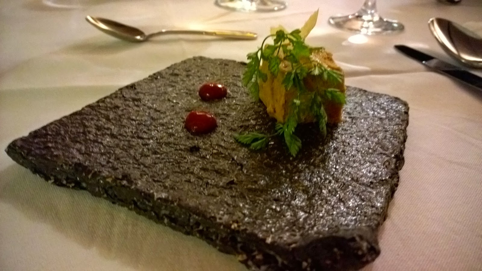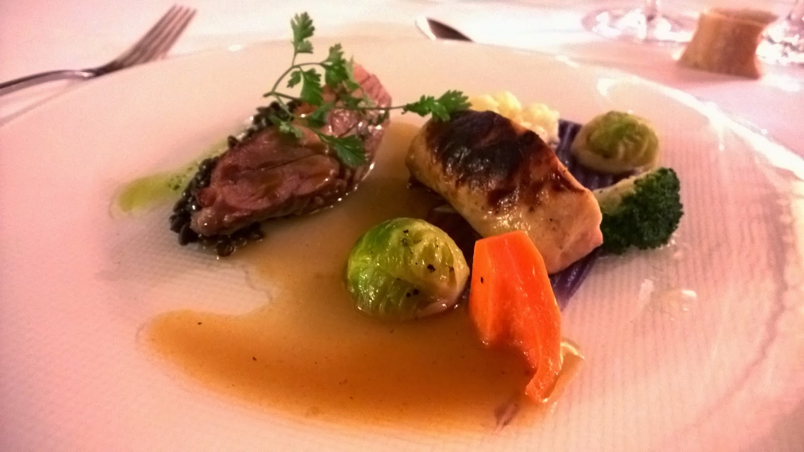 | Kopun z jurčki in s črnimi orehi Krema rdečega zelja Črna leča z zelenjavo Kostanjev kipnik Vila Podvin, Radovljica, Slovenija |