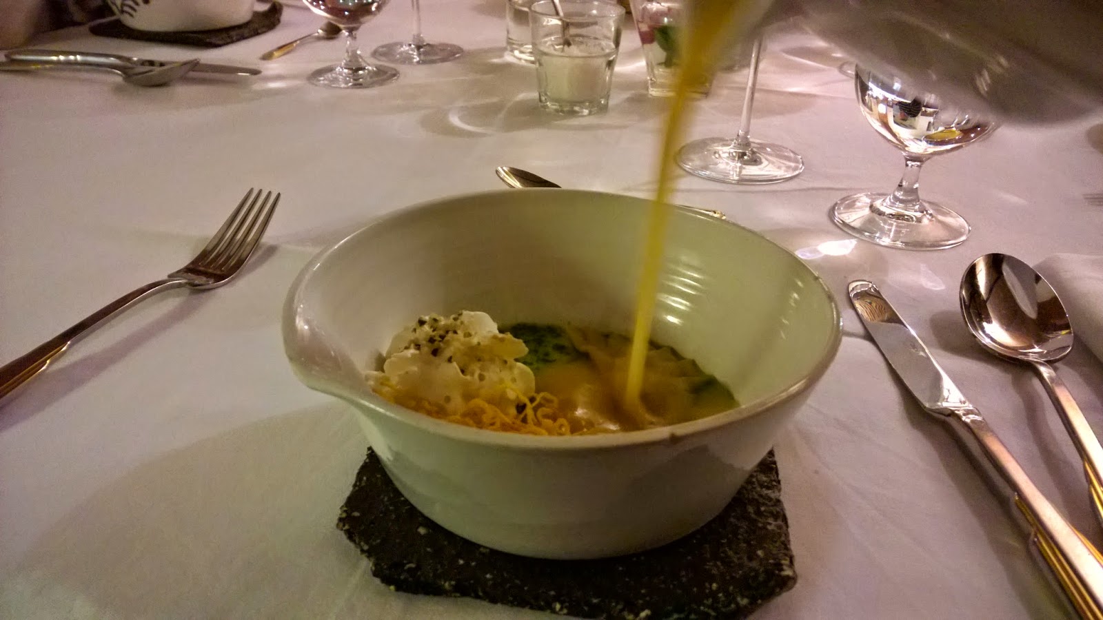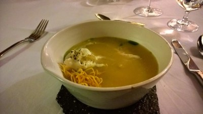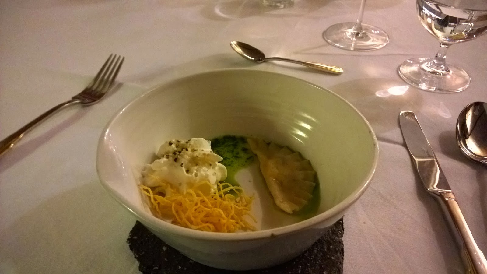 | Kolerabna juha z Darjinimi konopljinimi semeni Beravseva jogurtova krema Ajdov krapec polnjen s tepko Kolerabni rezanci Vila Podvin, Radovljica, Slovenij |