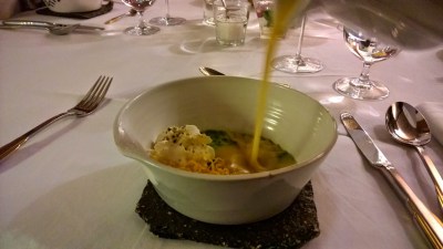 | Beravseva jogurtova krema Ajdov krapec polnjen s tepko Kolerabni rezanci Vila Podvin, Radovljica, Slovenija |