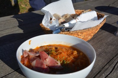 | Zasluženo planinsko kosilo – jota z zeljem in šinkom ter domač kruh. Sv. Jakob, Slovenija |