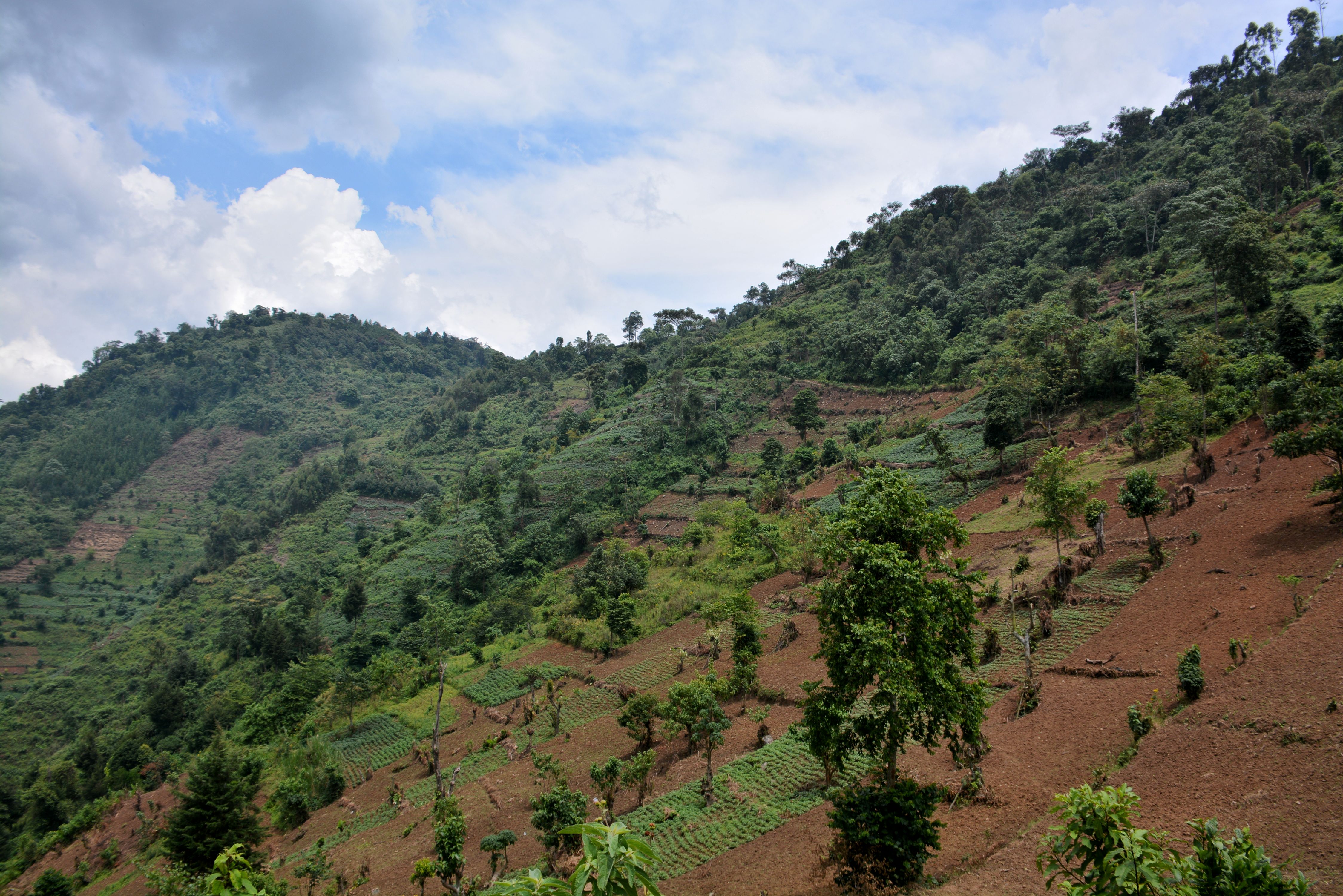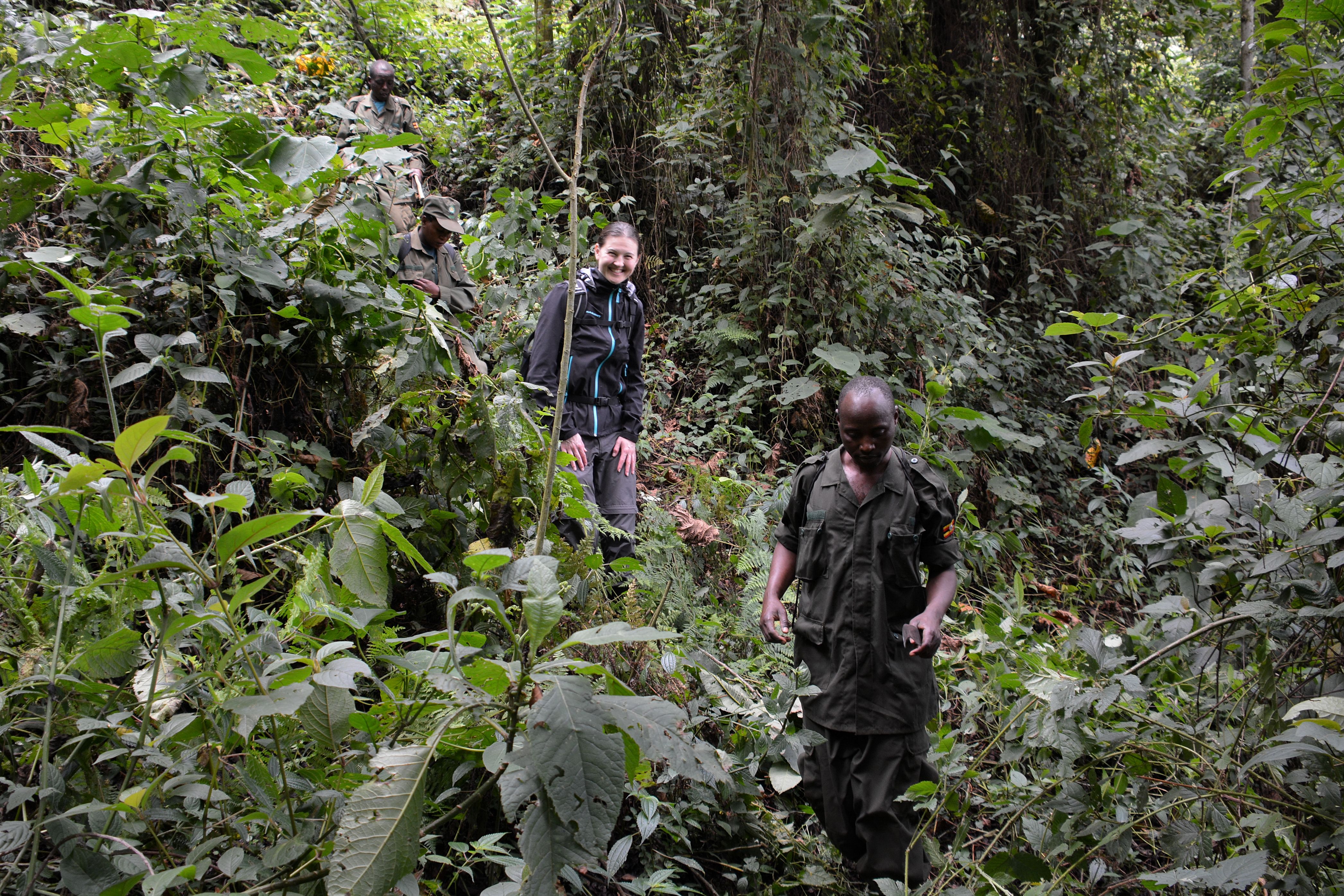 Začnemo hoditi in gremo kakšno uro v strm klanec kar po cesti, saj ne moremo nadaljevati z avtomobilom. Ker sva sama, nam gre zelo hitro in smo prvi na vrhu. Za nami je še ena polna skupina, ki gre do druge družine. Zelo je vroče in soparno, k temu pa doda še hoja po soncu in najina oblačila. Namreč oblečena sva v anorak in dolge hlače, pa hrana v nahrbtniku za cel dan. Teče iz vseh por do konca – naravna savna. Do vhoda v gozd imamo dobro uro z dvema počitkoma. Vodička je vso pot na vezi z »trackerji«. To so pa najpomembnejše osebe v skupini in to so ljudje, ki spremljajo gorile vsak dan in jih pripravijo na obisk ljudi. Oni gredo v gozd pred nami, zjutraj okrog sedmih, da najdejo gorile za nas in da ne bi preveč hodili. Nato pa sporočajo po vokitokiju vodičem lokacijo.