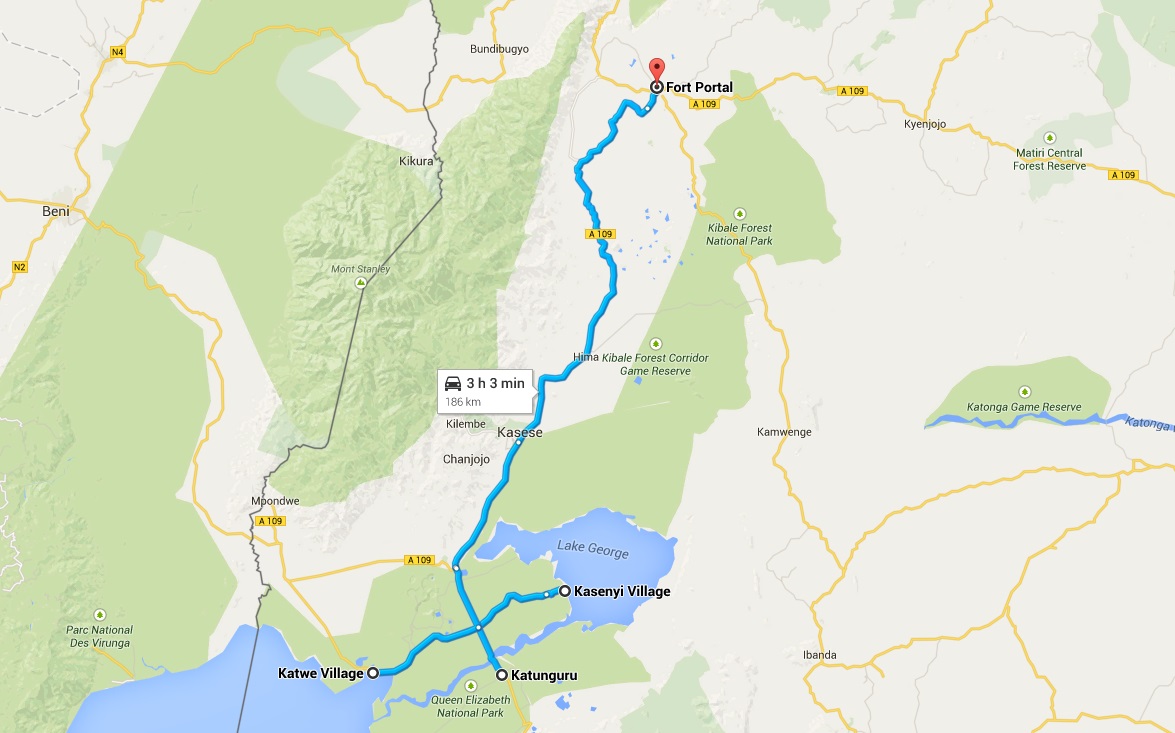 Čas vožnje = po parku 5 ur, QENP – Fort Portal 3 ure