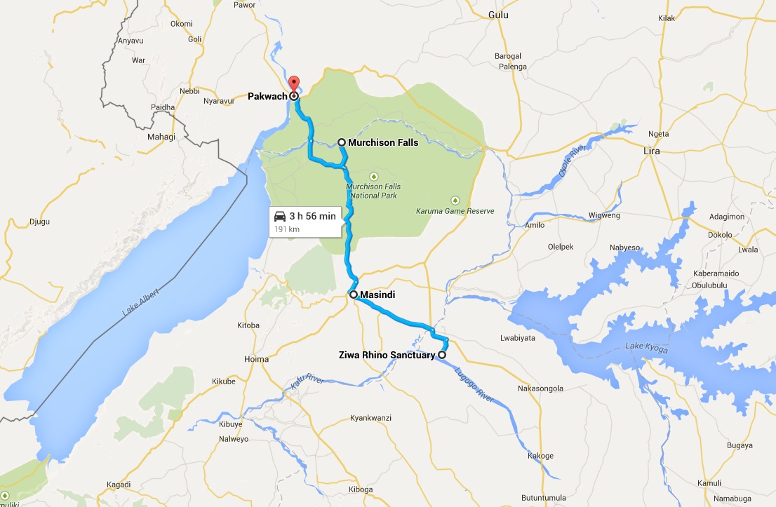 Čas vožnje = Ziwa – Masindi 1 ura, Masindi – Murchison Falls razgledna točka 1,5 ure, Murhison Falls – Pakwach 2 uri