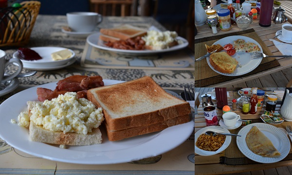 Za zajtrk so nama največkrat postregli običajno kot povsod po svetu. Sveže sadje, jajčka, marmelada, med, margarina, jajčna omleta z zelenjavo, palačinke… Nikakor ne smem pozabiti na kavo in pravi čaj v termovkah ter sveže stisnjeni sadni sokovi. Nadvse okusni obroki, kjerkoli sva že prenočila.