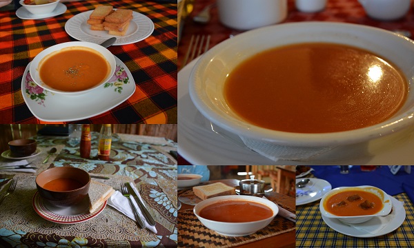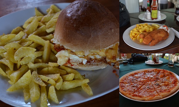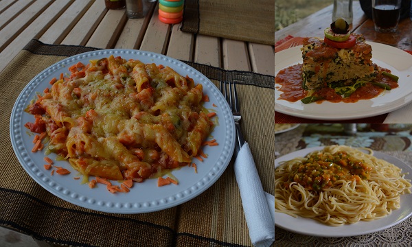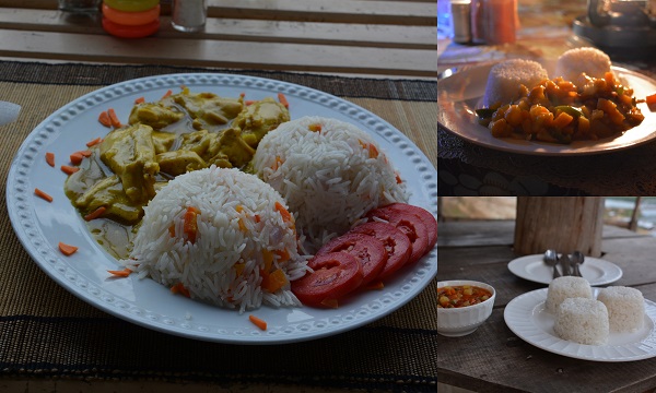 Glavni obroki so večinoma iz zelenjave, redko se znajde na krožniku tudi meso. A vendar je zelenjava tako okusna, da mesa niti nisva pogrešala. Že takoj po prihodu sem ugotovila, da pridelujejo ogromne količine paradižnika in da je ta zagotovo odličen. Tako da je bila paradižnikova juha vsak dan na jedilniku. Bodisi za kosilo, bodisi za večerjo. Pogosto sva izbirala tudi “club” sendviče s paradižnikom in sirom ter mogoče slanino. Riž z zelenjavno omako je bil zelo slasten, pa tudi razne vrste testenin. Našla sva tudi nepogrešljivo pico. Uganda je poznana po kozjih nabodalcih in po sladkovodni ribi vrste Tilapia. Čeprav sva velika ljubitelja ocvrtega krompirčka, sva se ga tokrat res prenajedla, saj ga dobiš prav pri vsakem obroku.