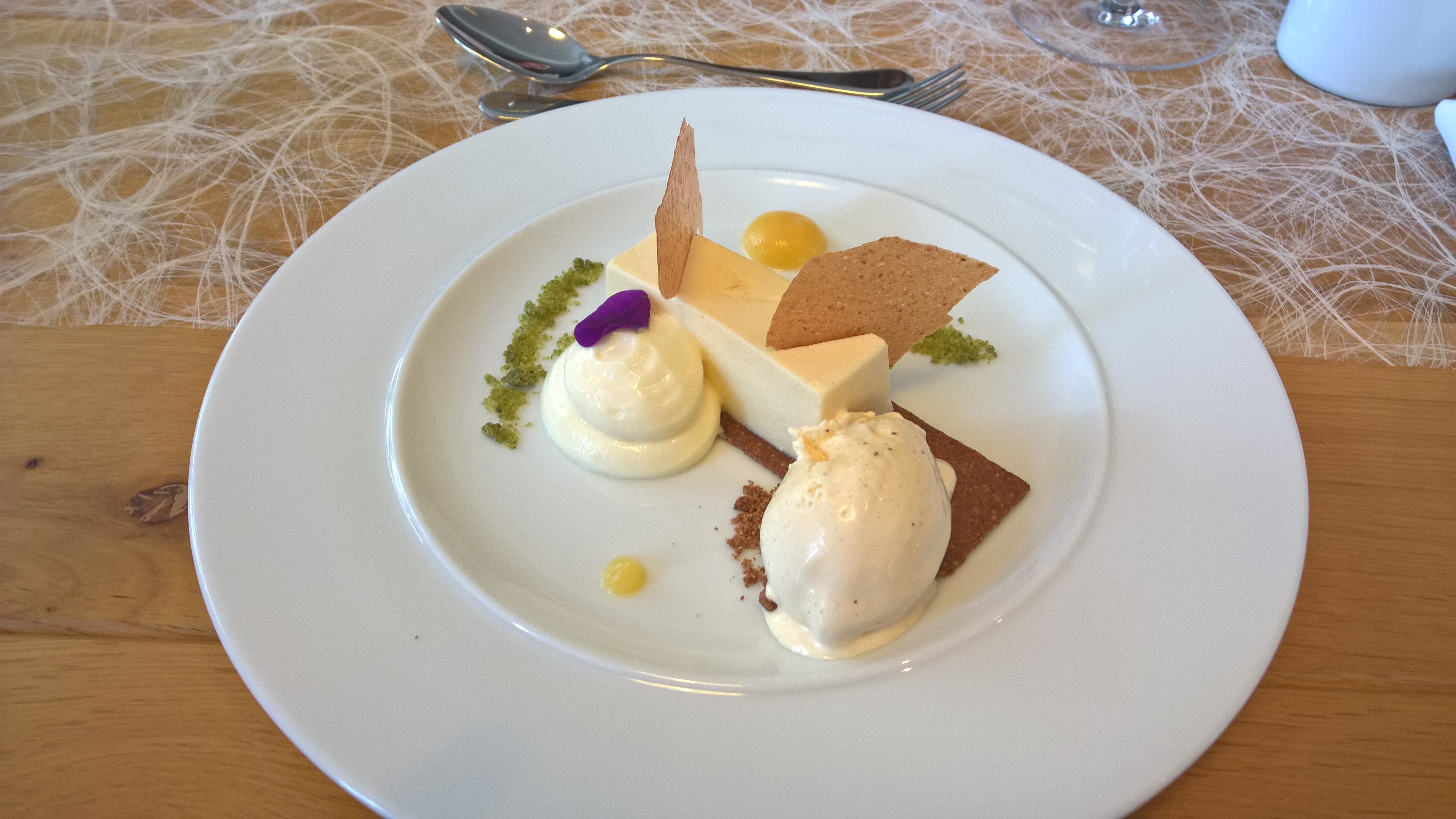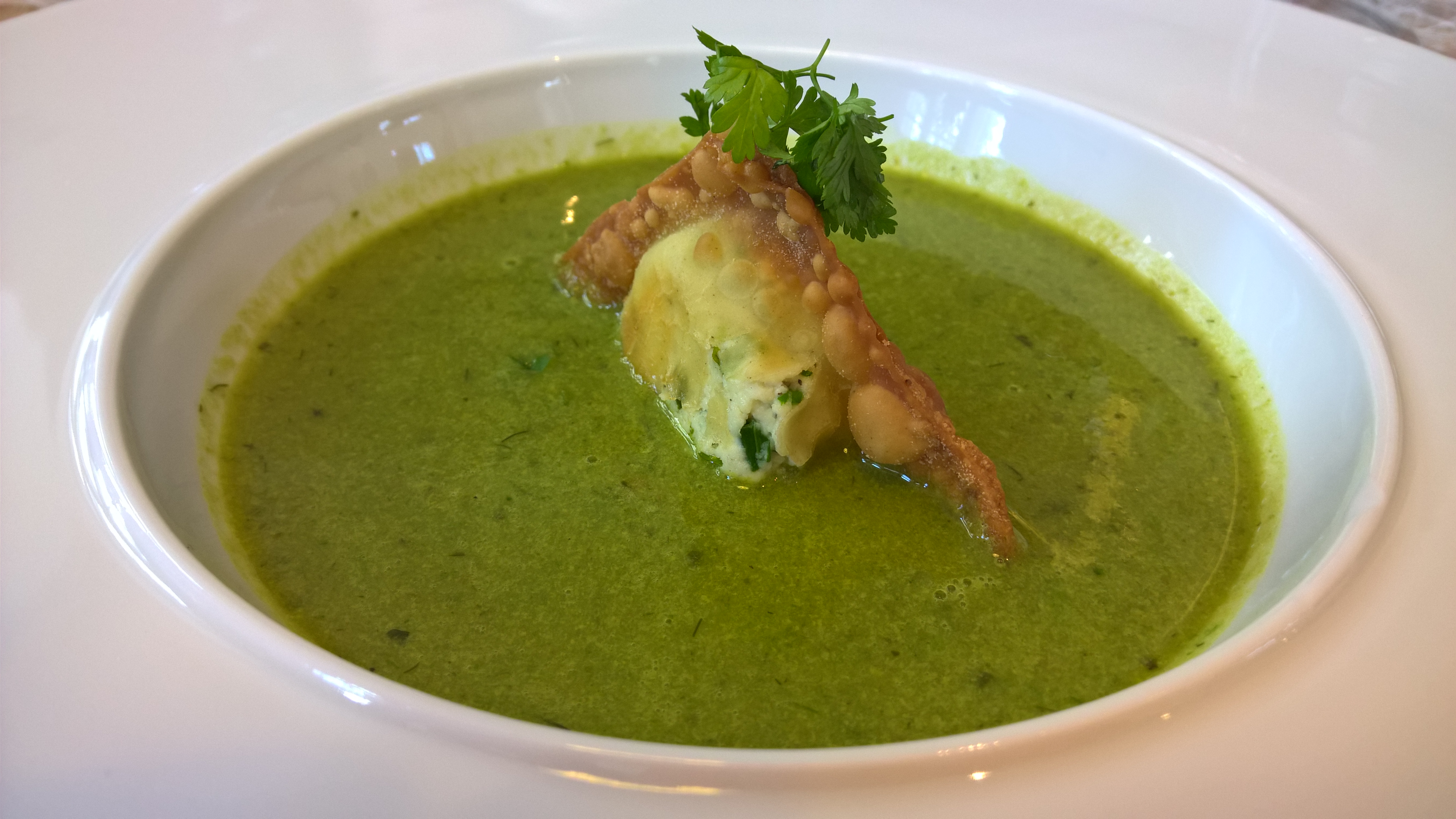 Kremna juha čemaža, krebuljice, šparglev, s “solato” mini ješprena, hruške in jabolka, raviol skute.