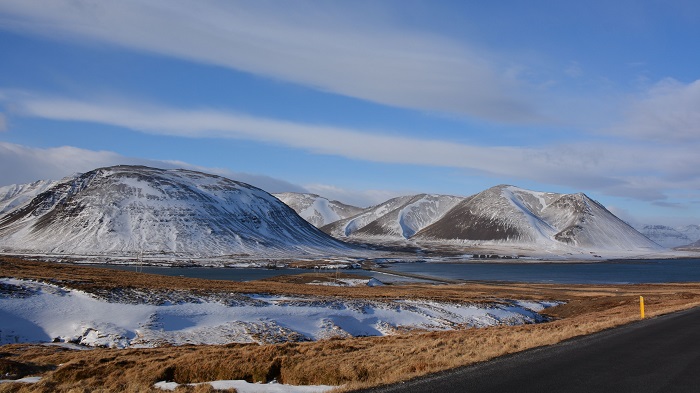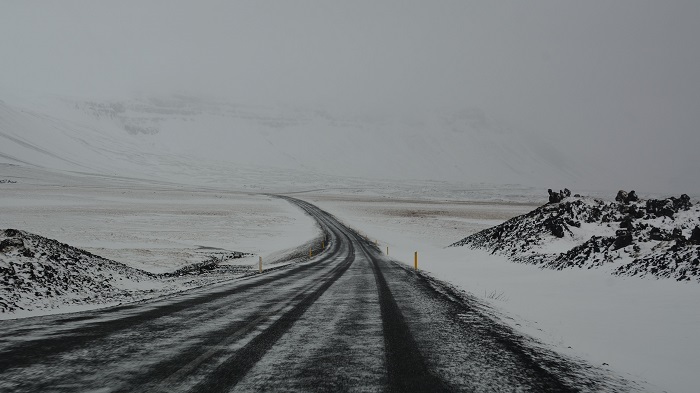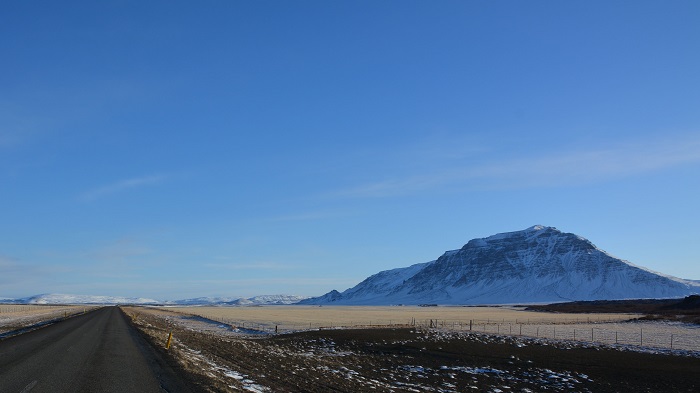 Vsakih nekaj kilometrov sva se ustavljala, da bi naredila fotografijo, tako zelo naju je pokrajina očarala. Na cesti nisva vse do cilja srečala niti 5 avtomobilov. Ob majhnemu mestu Grundarfjördur stoji osamelec Kirkjufell, ki daje mestu poseben čar. Še nekaj kilometrov pred mestom sva imela sonce in modro nebo. Le nekaj minut zatem pa že snežni vihar, da nisva videla niti en meter pred seboj. Ja, to je Islandija. Vreme se spreminja iz minute v minuto.