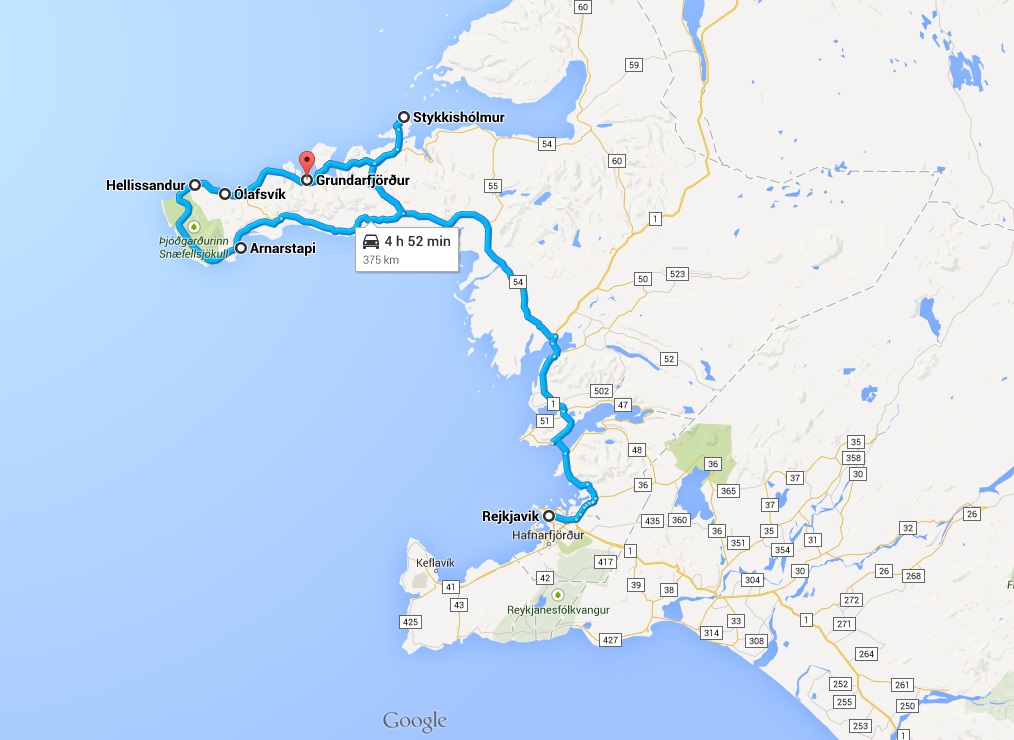 Na Islandiji se sicer zdani že okrog petih in v tem letnem času se dolžina dneva močno podaljšuje. Vsak dan se je podaljšal dan za 14 minut in v enem tednu je bil dan že daljši za celo uro. Čuden občutek, ko moraš še pri popolni dnevni svetlobi v posteljo. Na pot sva se podala že okrog šestih zjutraj, saj sva imela organiziran ogled ork že ob 10. uri iz mesteca Grundarfjördur. Do tja je iz Reykjavika skoraj 3 ure vožnje po najbližji poti. Cest še nisva poznala, zato sva si vzela tudi nekaj rezerve za vsak slučaj.