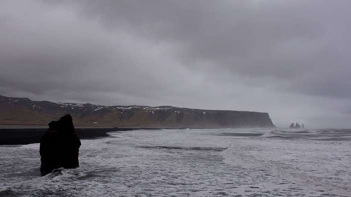 Končno prispeva še do zadnje najine današnje postojanke. V okolici mesta Vík in Mýrdal je dolga črna peščena plaža, ki je na trenutke resnično dramatična. Atlantski ocean ustvarja ogromne valove, ki z neverjetno močjo udarjajo ob obalo. Dyrhólaey je rt, ki nam podari prekrasen pogled na obalo in svetilnik ter hkrati doživetje neverjetne moči Atlantika. Voda tako glasno buči, da se ne da niti pogovarjati. Veter je pihal s takšno močjo, da najprej nisem mogla niti odpreti vrat avtomobila, potem me je pa premikal tudi za en meter.