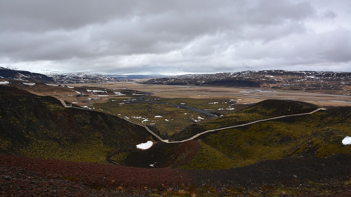Prva današnja postojanka so bili vulkanski kraterji Grábrokargígar, ki so že na daleč vidni z glavne ceste. Na nekaj metrov razdalje so trije vulkanski kraterji lepih in naravnih oblik. Zaščiteno področje že od leta 1962 je prav nenaravno. Po vnaprej določeni peš poti sva se sprehodila do vrha enega od kraterjev in si ogledala pokrajino z višav. V daljavi sva videla celo jezero, ki pa je bilo še pokrito z ledom. Na vrhu je pihalo tako močno, da me je skoraj odpihnilo.