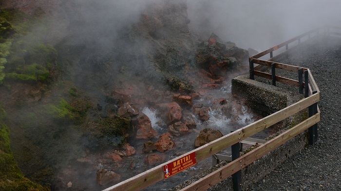 Tokrat je bil najin izbran hotel res TOP. Ob golf igrišču, z zunanjimi bazeni z vročo vodo in pogledom na hribe. V naslednjih minutah najdeva dovolj energije še za naslednjih 100 kilometrov do slapa Hraunfossar. V hotelu še preveriva razmere na cesti in nama zagotovijo, da je cesta do tja odlična. Že čez nekaj minut drviva proti slapu in se na poti ustaviva še ob geotermalnem izviru Deildartunguhver. Ta del države je prav tako poln geotermalnih izvirov in vrelcev, zato tudi ne presenečajo gotermalne elektrarne ter ogromni raslinjaki, v katerih pridelujejo sadnje in zelenjavo.
