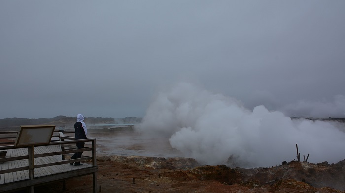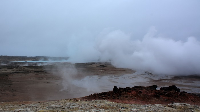 Na poti sva se ustavila tudi ob naravnih geotermalnih vrelcih, ki sva jih že prej videla tudi na skrajnem severu države. Tudi ta del države leži na zelo vulkansko aktivnem področju, zato je teh izbruhov precej. Temu seveda je primerno tudi število geotermalnih elekrarn in geotermalno kopališče Blue Lagoon.