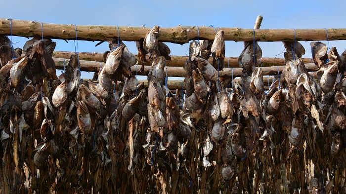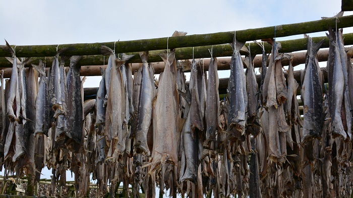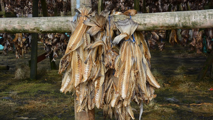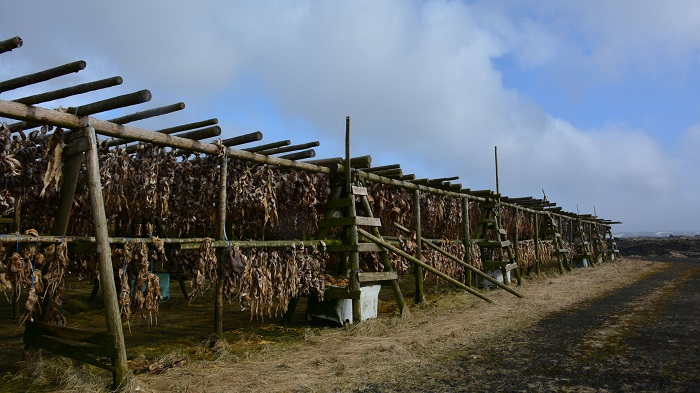 Na poti nazaj proti Reykjaviku sva ob cesti čisto slučajno opazila še sušilnico polenovk na prostem. Nikoli je še nisva videla, zato je bil postanek za naju res nekaj povsem novega in zanimivega. Tudi dostop je bil povsem odprt in nikjer žive duše, tako da sva lahko v miru naredila nekaj fotografij. Če je še nekaj minut prej bilo strašno vreme, je tokrat že sijalo sonce. Polenovke sušijo na prostem in različne dele skupaj. Torej najlepše meso skupaj, glave skupaj, kosti skupaj. Povežejo jih v snope in to je to. Hkrat nastavijo plastične posode, v katere sproti mečejo odpadne in pokvarjene dele. Smradu resnično ne bi niti omenjala. Zdaj tudi jaz vem, kje in kako nastane glavna sestavina odličnega bakalarja.