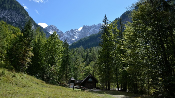 Med spustom sva se najprej ustavila pri leseni kapelici in si seveda privoščila kosilo na planini Jasenje v Koči pri Ingotu.