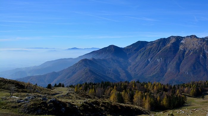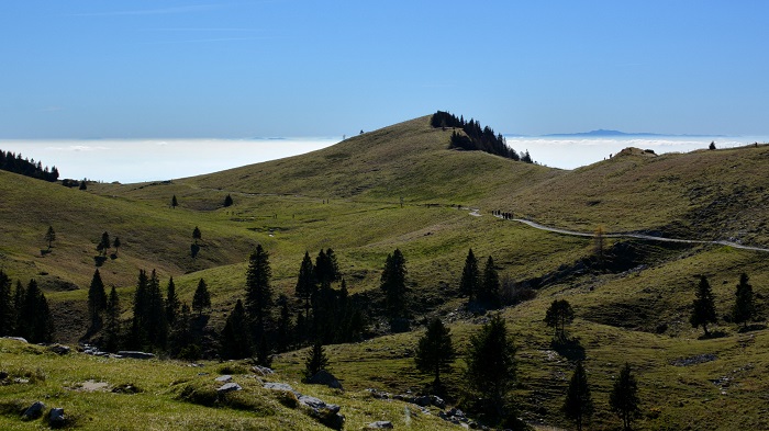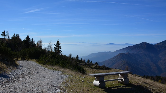 V dolini je bila gosta megla, zato sva jo hitro mahnila na planino. Vremenska napoved je bila več kot odlična, saj je bila temperaturna inverzija. Torej na planini precej topleje kot v dolini. Z nihalko sva se peljala do zgornje postaje, kjer naju je pričakalo kičasto jesensko vreme – sonce, temperatura 15 st.C in brez oblaka. V kratkih rokavih sva jo mahnila skoraj do planine Konjščica po gozdni poti. Nekoliko pred planino sva zavila desno in povsem sama uživala svež gorski zrak, tišino in razgled na Kamniško-Savinjske Alpe. Nato sva se usmerila proti Velikemu stanu na Veliki planini. Popoln sprehod po planini sva dopolnila z domačimi štruklji v gostilni Zeleni rob. Nato sva lepo počasi odkorakala proti spodnji postaji nihalke. Popoln jesenski dan.