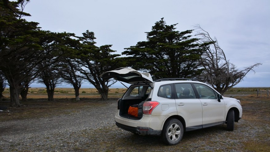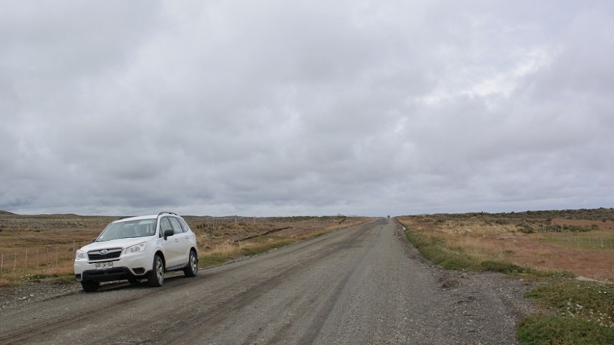 Najina agencija za prevzem avtomobila je imela sedež v mestu, zato sva kar peš prevzela avtomobil. Ker nisva vedela kaj naju čaka, sva si najela malo večji terenski avto s štirikolesnim pogonom. Dobila sva Subaru Forester 4×4, ki je bil res odličen avto za raziskovanje skritih kotičkov Čila. Nemudoma sva se odpravila na pot proti Porvenirju. Prvih 300 kilometrov do trajekta v Punta Delgadi sva prevozila po lepi in novi asfaltirani cesti. Tu in tam sva zagledala kakšno lamo ali gvanako ob cesti.