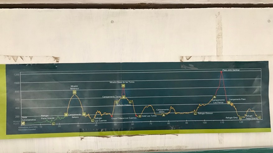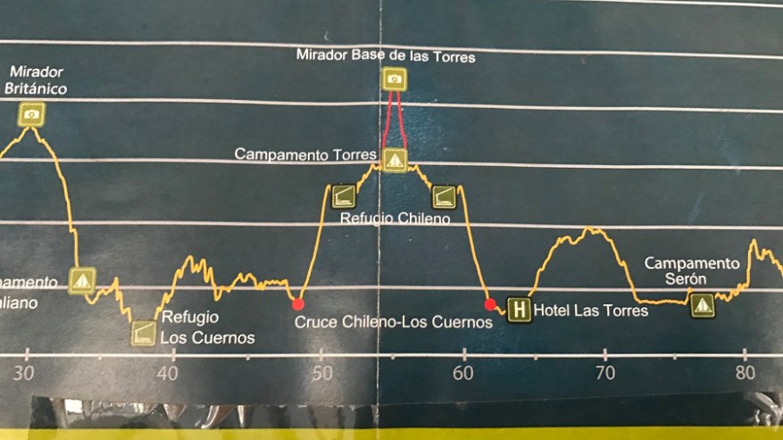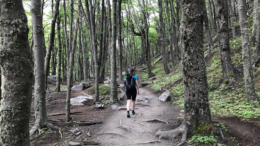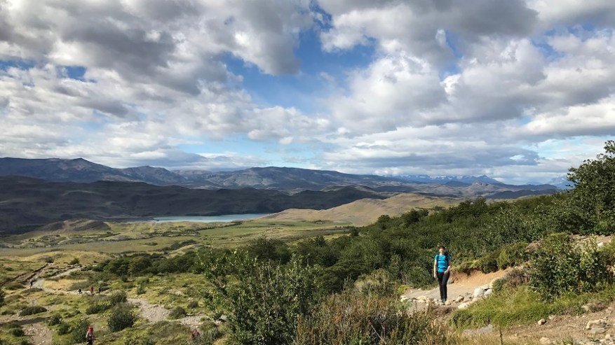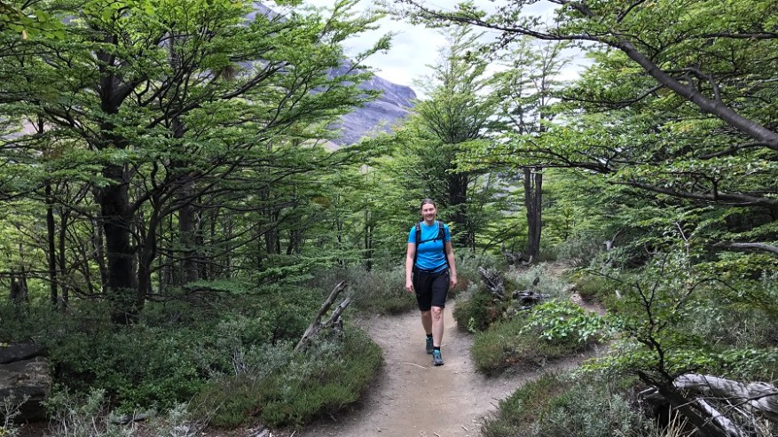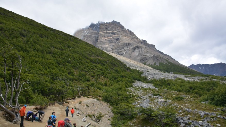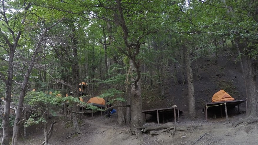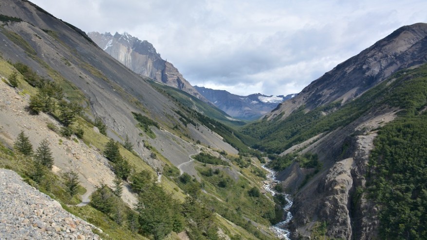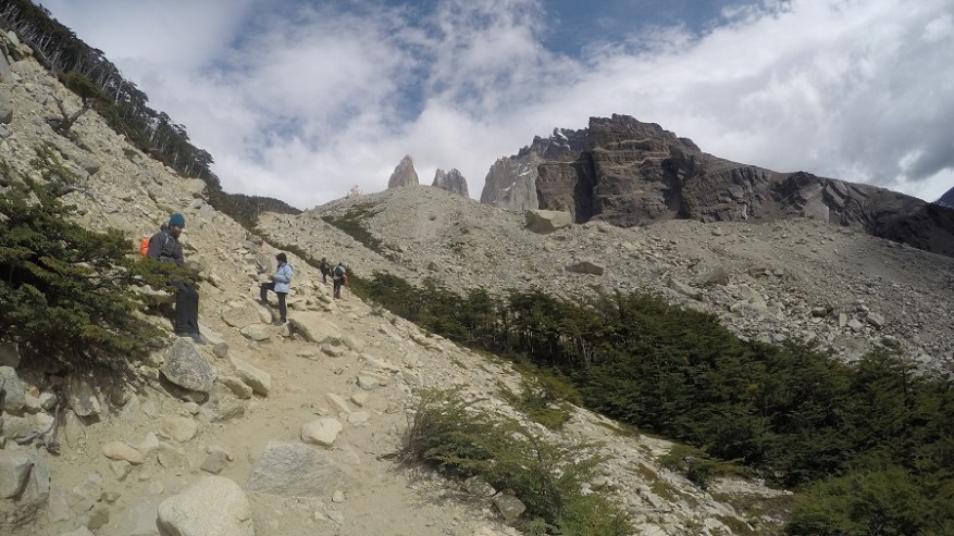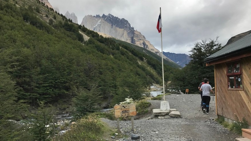 Hoditi sva začela pri kampu, ki se nahaja pod špičaki Torres del Paine in nadaljevala mimo prekrasnega hotela Las Torres Patagonia. Se mi je kar zahotelo, da bi tukaj spala kakšno noč v prihodnosti. Vreme je res bilo krasno – sončno in toplo, tako da sva ob prvem vzponu kar hitro odvrgla skoraj vsa oblačila. Prva tretjina poti se začne kar hitro precej vzpenjati, zato se vam začnejo nuditi krasni razgledi na jug parka, jezera in reke. Poteka tudi po odprtem, tako da vas sonce zelo lepo greje. Ta prva tretjina poti vas pripelje tudi na vrh do melišča, kjer ste zelo jezni, saj se morate krepko spustiti do prve koče na poti. Refugio Chilleno je postavljena na dno doline, ob reko in v hladen gozd. Tukaj se lahko okrepčate in tudi kampirate na prostem. Do tukaj si lahko privoščite tudi konja, ki vas bo pripeljal iz doline do koče (ni poceni).