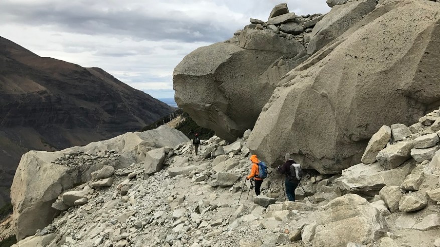 Pri zadnjem kampu je pa vreme pokazalo zobe. Ker sva prišla ponovno iz gozda na odprto, je pihalo tako močno, da me je kar premikalo. Vsa oblačila sva zopet navesila nase in nadaljevala pot. Od tukaj je namreč še dobro uro peklenskega vzpona. Ne popusti niti za korak, ves čas si na odprtem, saj poteka pot po skalah in melišču. Največji hudič pa je v tem, da prav do zadnjega koraka ne vidiš ničesar, saj je laguna skrita za meliščem in skrivajo se tudi vrhovi. Ma res, prav znoriš, ko grizeš vsak korak proti koncu, ker ne veš – ali bodo špičaki vidni ali ne.