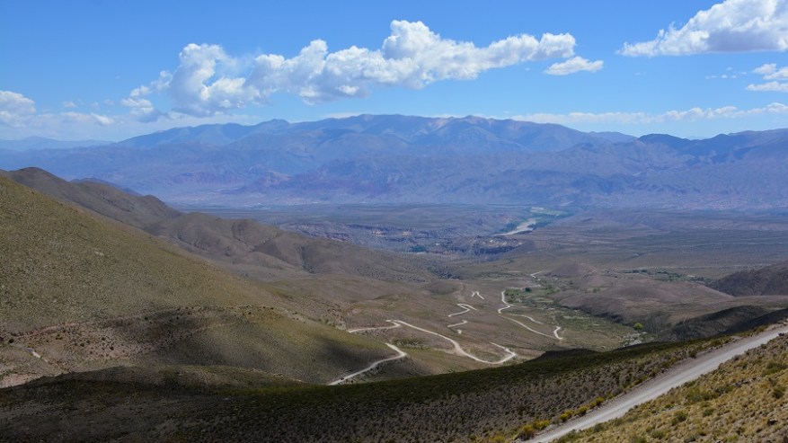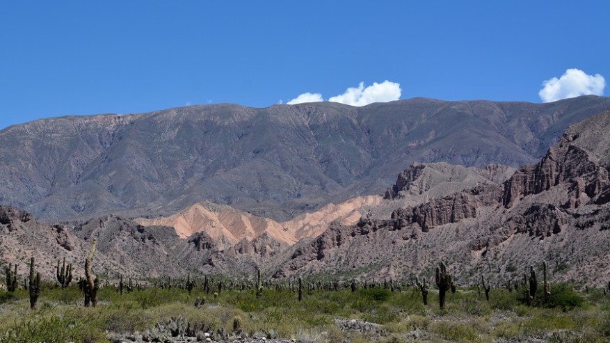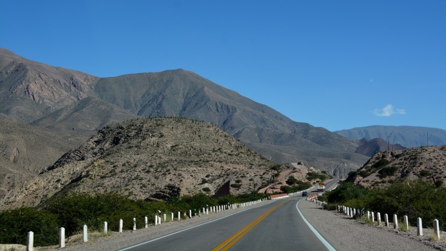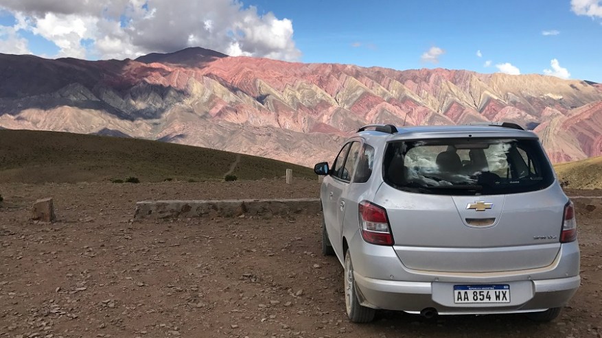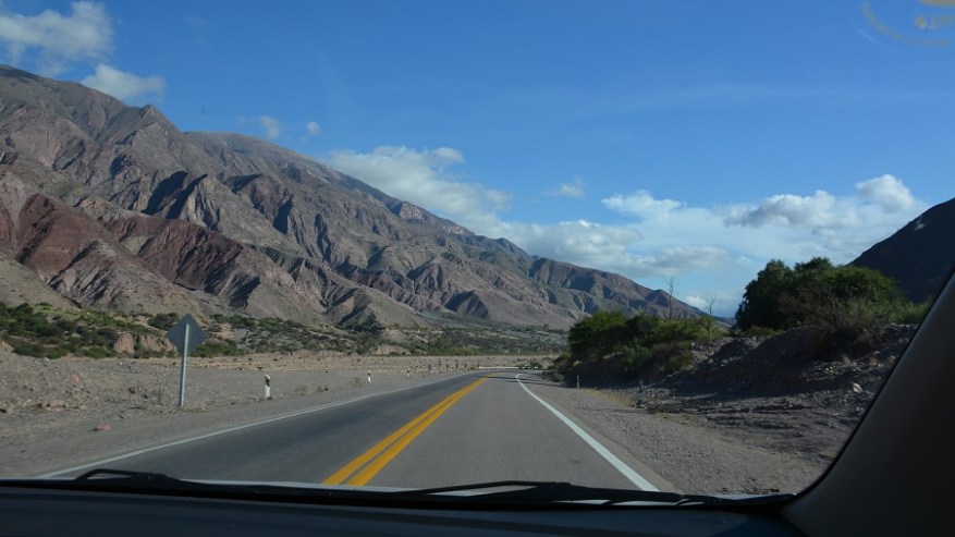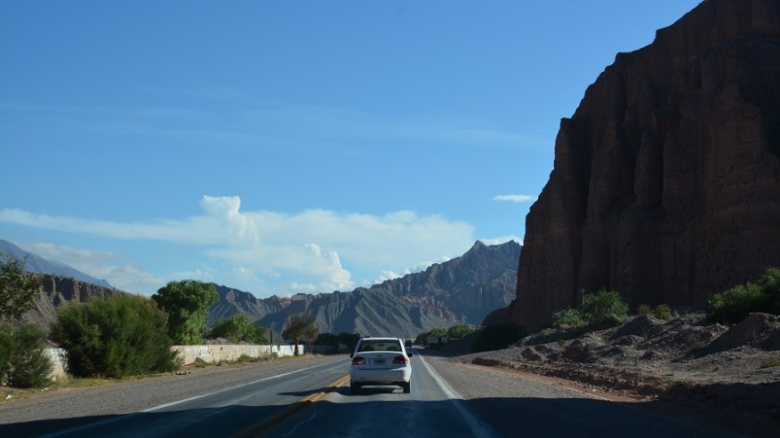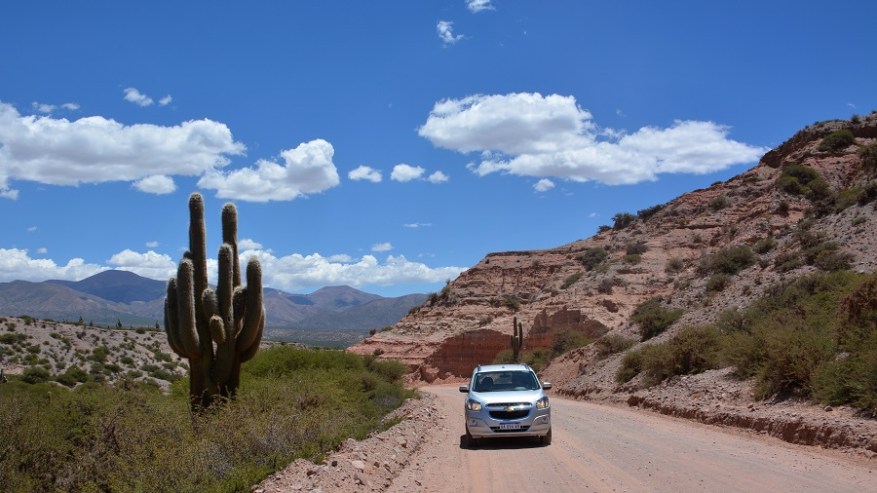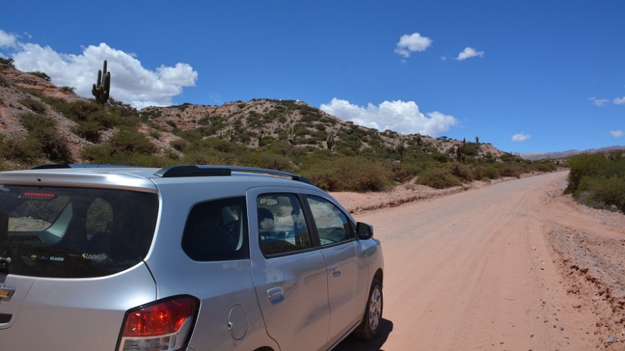 Že doma sva si rezervirala avto na http://www.rentalcars.com in izbrala malce bolj dvignjen in robusten avtomobil. Vedela sva, da ga bova potrebovala za makadamske ceste, ki jih imava v planu prevoziti. Avto sva najela za dva dni in z njim naredila en krog na sever in enega na jug naslednji dan. Vsak dan naju je čakalo več kot 500 kilometrov vožnje, a se je izplačalo. Cesta iz Salte na sever proti mestu San Salvador de Jujuy je lepa, asfaltirana in nekaj časa je celo štiripasovnica. Tam še nekako gre s hitrostjo, potem pa se cesta kmalu zoži v dvopasovnico, po kateri poteka ves promet na sever države in čez mejo v Čile ter predvsem v Bolivijo. Ogromno tovornega prometa, pa tudi osebnih avtomobilov, zato gre res počasneje. Cesta se ves čas počasi dviguje, saj je mestece Purmamarca že na nadmorski višini 2.324 metrov. Kmalu se je promet zredčil, midva pa sva začela uživati v noro lepi pokrajini. Barvni hribi in ogromni kaktusi. Čudovito.