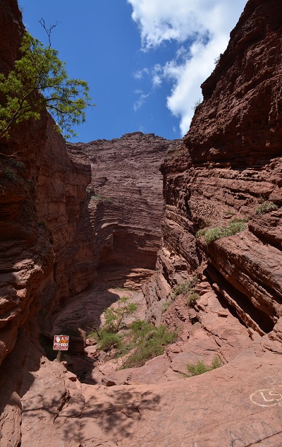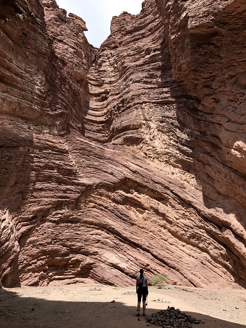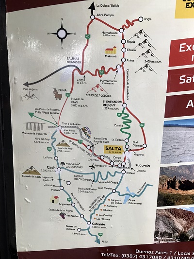 Danes sva imela še najeti avtomobil, zato sva se v zgodnjih jutranjih urah odpravila na jug. Med vožnjo do prve razgledne točke nad kanjonom sva lahko opazovala ogromne nasade tobaka ter vedno več je bilo tudi vinogradov. Pokrajina je bila še vedno posejana s pisanimi hribi, suhimi kanjoni in ogromnimi rečnimi strugami. Na poti v Cafayate sva si premislila in vseeno obiskala dve vinski kleti. Mesto Cafayate je obkroženo v številnimi vinskimi kletmi, zato je izbira kar težka. Prva je bila stara klet v centru mesta z imenom Bodega El Esteco, nato pa sva obiskala še ultra moderno vinsko klet Piattelli. V Piattelliju sva si privoščila vrhunsko kosilo in kozarec njihovega odličnega rdečega vina sorte Malbec. Nazaj grede sva si ogledala še naravni obelisk, ozek amfiteater z odlično akustiko in Hudičevo grlo.