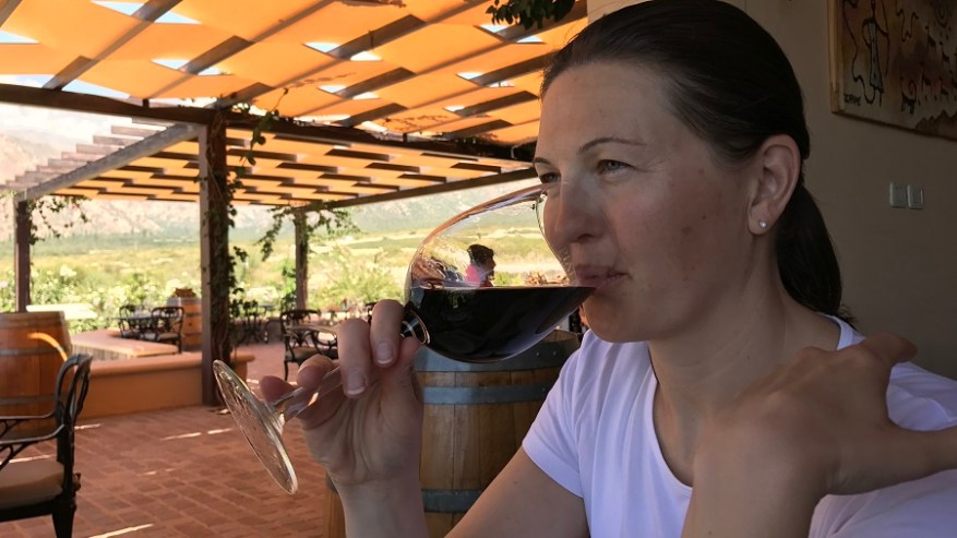 Medtem ko sva si ogledovala vinsko klet Bodega, sem v vodiču Lonely Planet prebrala, da je zelo blizu res moderna, lepa in predvsem vinska klet z odličnimi vini povsem v bližini. Matjaž je še malce okleval, jaz pa sem hotela tja na vsak način. Zapeljala sva se proti hribu in že na vhodu pri vratarju samo izbuljila oči. Ko sva se parkirala, sva skoraj padla na rit. Več milijonov vredna moderna in povsem nova vinska klet, ki leži na hribčku s čudovitim pogledom na celo vinorodno pokrajino. Na trti ogromni in sočni grozdi, iz katerih pridelujejo mnogo vrst vin, ki vsako leto poberejo največje svetovne nagrade. Z odprtimi usti sva vstopila in se odločila za kosilo namesto ogleda in pokušine vin. Štirihodni meni na čudoviti terasi je bil odličen. Kozarec rdečega vina njihove sorte Malbec pa je bil res čudovitega, sladkega in polnega okusa. Povsem drugačno od naših rdečih vin. Res se opazi količina sonca, ki ga dobi tukajšnje grozdje. Toplo priporočam, če boste v tem delu sveta, da obiščete to vinsko klet in si privoščite razvajanje svojih brbončic.