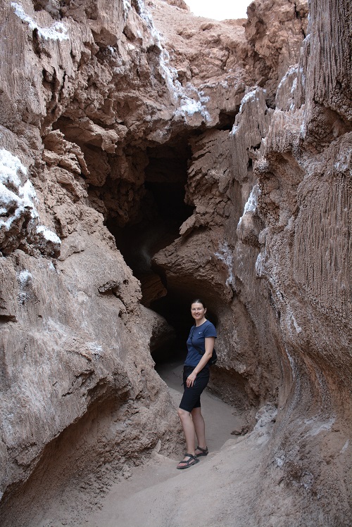 Ponovno sva se veselila nekoliko daljšega spanca, obilnega in okusnega zajtrka ter prostega dopoldneva. Oh, kako se je prileglo po toliko dneh nenormalno zgodnjih ur zbujanja in hitenja. Tokrat sva imela popoldanski izlet z agencijo v Moon Valley. Dolina Lune ali Valle de la Luna je ena najbolj pustih in suhih pokrajin na svetu, zato jo primerjajo s površjem Lune in Marsa. Nekateri predeli niso že več 100 let videli niti kaplje dežja. Najprej smo se odpeljali na razgledno točko nad dolino, nato pa se sprehodili po eni izmed mnogih nadzemnih jam. Vsa belina na površju je kristalizirana sol posušenih jezer. Ogledali smo si še naravni amfiteater ter na sipini pričakali romantičen sončni zahod. Divja in povsem nenaravna pokrajina. Woho, bila sva tudi na Luni.