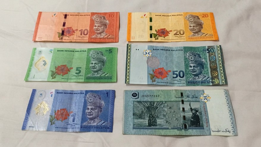 V Maleziji sva že ob prihodu na letališču menjala nekaj Ameriških dolarjev za Malezijske ringite, saj na otokih ni bank in bankomatov. Na koncu se je izkazalo, da plačilna kartica Mastercard (in tudi ostale) dela povsod in da je najbolje plačevati kar s kartico, saj je veliko boljši menjalni tečaj kot v vseh menjalnicah po državi. Povsod, kjer je bilo možno, sva potem v nadaljevanju plačala s kartico (enako velja za Sumatro) in na ta račun na poti privarčevala kar 150 EUR. Razlika v menjalnem tečaju je bila namreč kar 15% in pri takšnih zneskih se seveda precej pozna. Nekaj storitev pa sva seveda morala plačevati z lokalnim denarjem in tam prihranka žal ni bilo. Tudi na Sumatri sva plačevala veliko s plačilno kartico (hotele, prevoze…) in enako v Kuala Lumpurju.