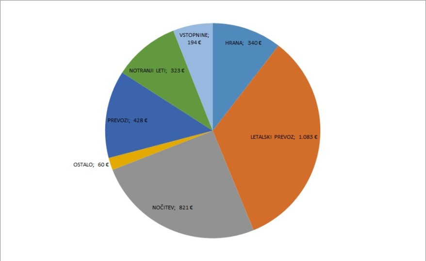 Na celotnem potovanju sva skupaj zapravila 3.249 EUR oziroma 1.624 EUR na osebo, od tega za 2 OSEBI: