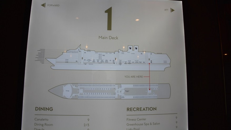 Najprej so nam pokazali razporeditev nadstropij na ladji. Ima kar 10 nadstropij, ki so tematsko razdeljeni. V prvih treh nadstropjih so sobe, ki jih povezuje dolg hodnik in razkošna dvigala. Vse sobe in prostori so dostopni tudi z invalidskimi vozički, tako da je tudi za ljudi s posebnimi potrebami zelo dobro poskrbljeno. Sledita dve nadstropji, ki so namenjeni druženju in zabavi. Sledita zopet dve nadstropji sob in apartmajev z balkoni. Zadnja tri nadtropja pa so ponovno namenjena skupnim prostorom za zabavo, druženje in razvajanje. Na vrhu je seveda tudi bazen, kjer se lahko predajate sončnim žarkom. Kamorkoli se na ladji obrnete, vas pričakajo lepo urejene oznake, tako da ne morete izgubiti v nobenem primeru orientacije. Zelo pogosto so lepo umeščeni tudi toaletni prostori.