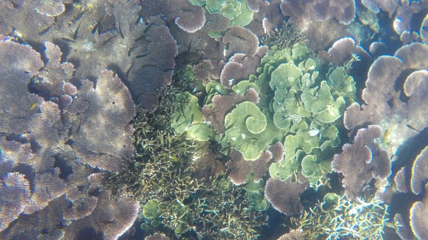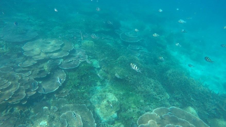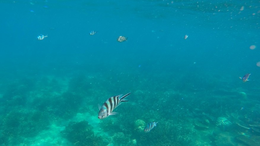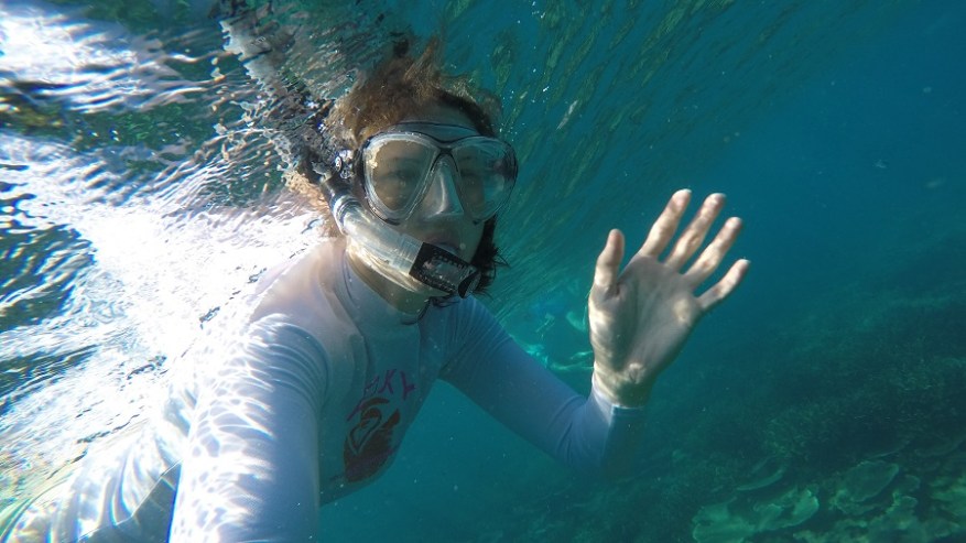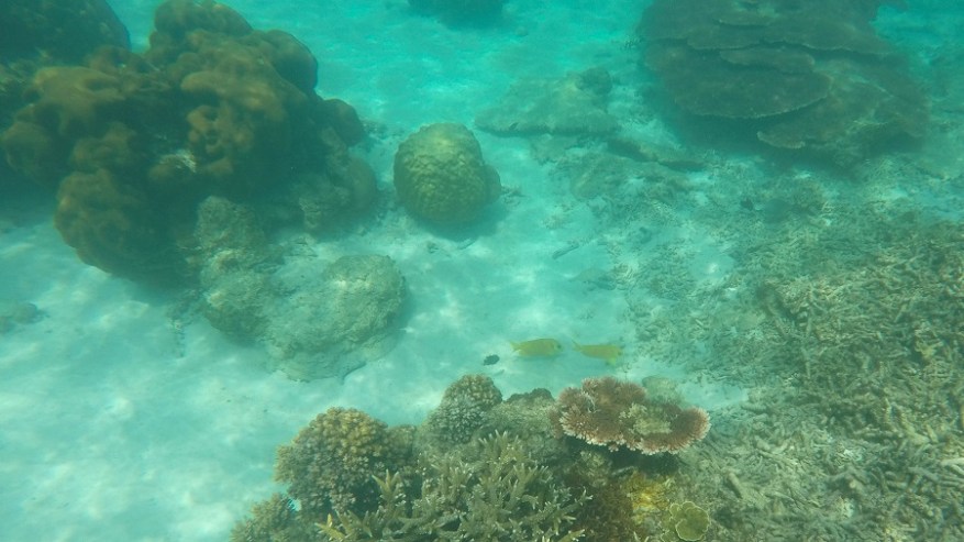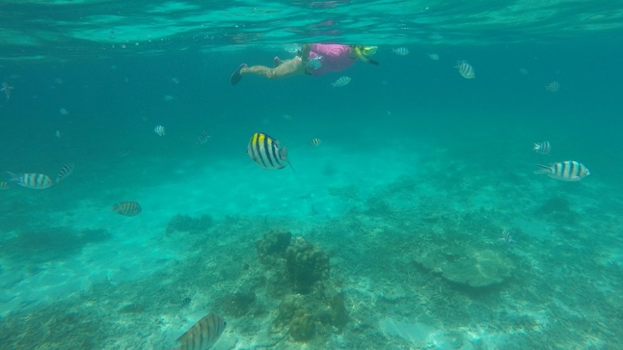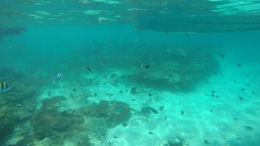 Z malim čolnom smo se odpeljali na zahodno stran otoka Kecil in tam preživeli v vodi slabe pol ure v enem od zalivov. Voda je bila čista, malih pisanih tropskih ribic pa toliko, da je bilo na trenutke kar strašljivo. Preveč! In še vse so se zaletavale vame in ne bežale stran. Te ribe tukaj so res čudne. Videla sem tudi veliko tistih oranžnih ribic, ki jih poznamo iz risanke Nemo, a so se skrivale v koralah na dnu.
