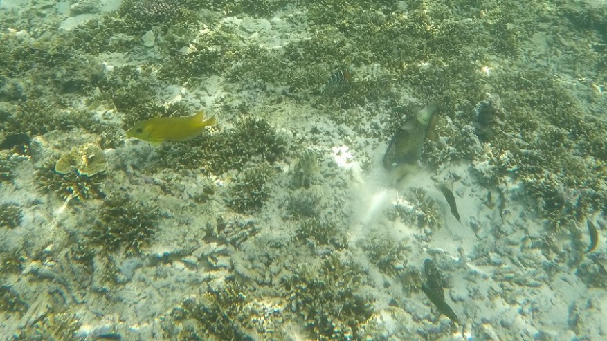 Na tretji točki mi je že zmanjkovalo energije in sem se najprej zvalila na mini plažo, potem pa stopila v morje. OMG. Kakšen podvodni svet. To je bilo pa res noro, noro. Globina morja le 1,5 metra, tako da so ribe čisto pred teboj. Nimajo se kam skriti. Rib pa toliko, da me je bilo na trenutke kar strah. In potem jaz lepo snorklam in gledam na dno, pa dvignem glavo in zagledam to BIG FISH. Od strahu me je kar odneslo v zrak in še sreča, da sem bila prvič kar nekaj metrov stran. To je bila modra riba z ogromnimi belimi ustnicami, velika pa konkretno več kot 1 meter in tudi skoraj enako visoka. In velikost sem lahko primerjala s človekom, saj se je ravno približevala drugemu iz skupine. OMG. Ja, o tej ribi so govorili moji Malezijci. Vse ostale ribe so XXXXXS v primerjavi s to ribo. Potem sem jih videla še res veliko in od zelo blizu. Po pravici mi je bilo kar malo strašljivo vse skupaj.