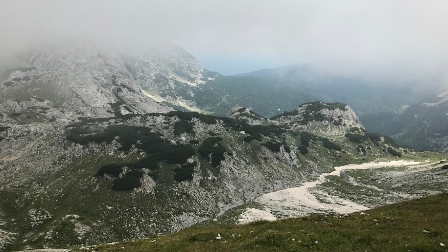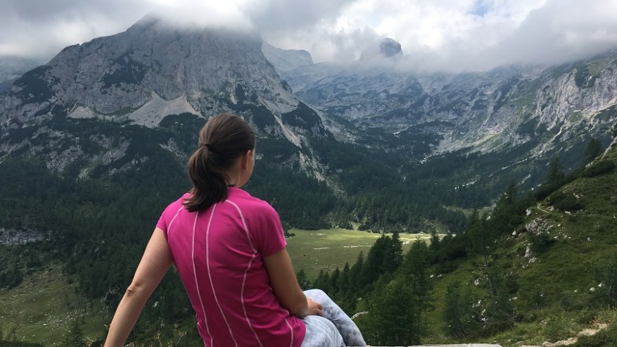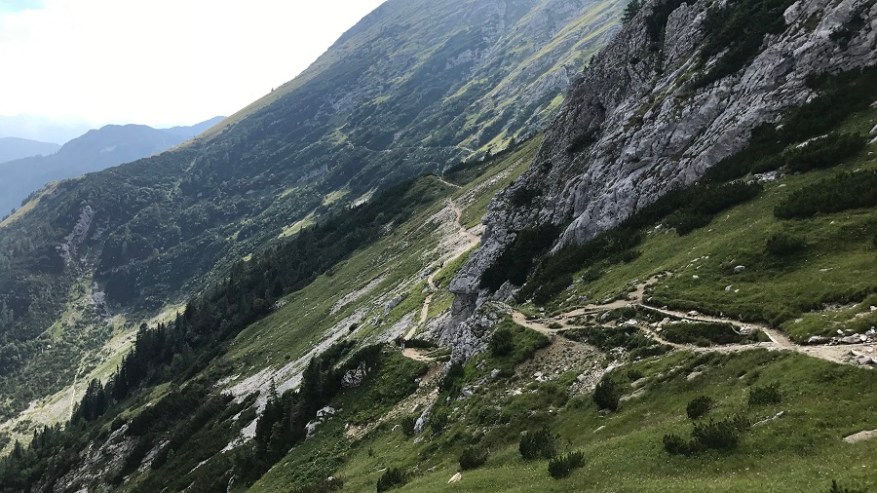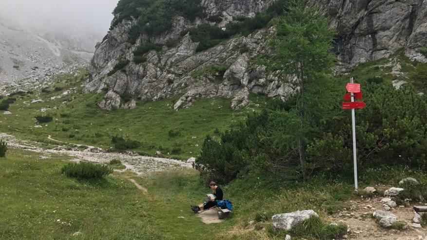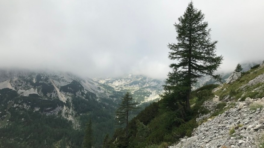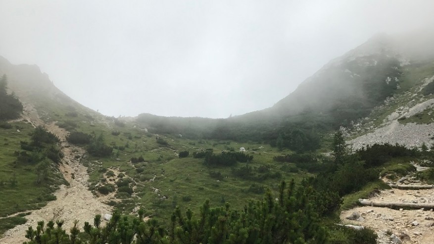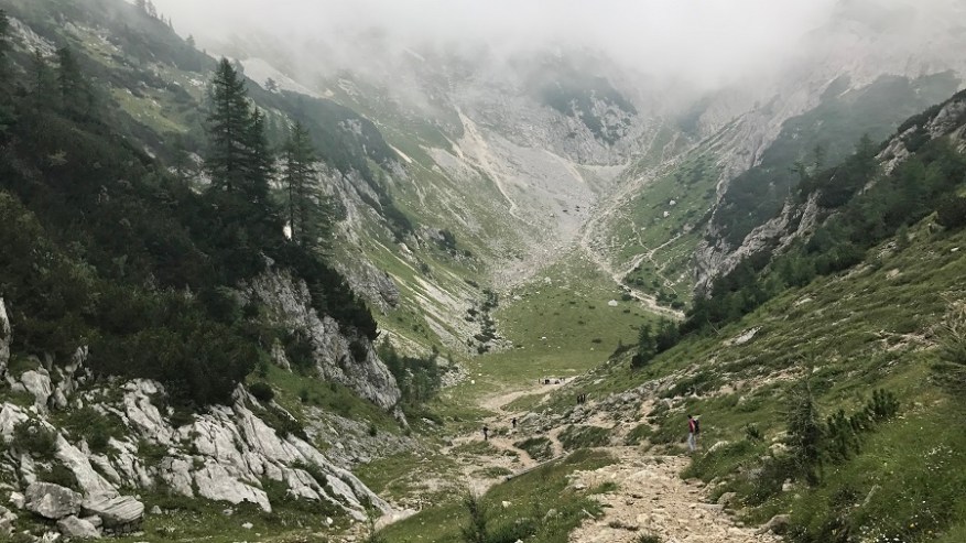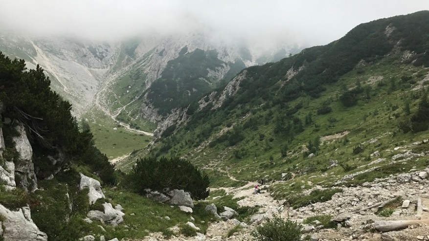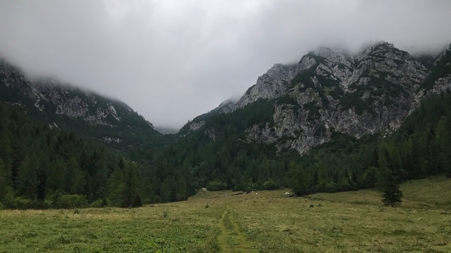 Mahneva jo po pašniku proti Studorskem prevalu. Srečava kar nekaj pohodnikov. Zelo veliko se jih je tudi že vračalo s Triglava nazaj proti izhodišču. Najprej se povzpenete do doline, kjer je travnik za krajši počitek, nato pa vas čaka še en lep vzpon do prevala. Želela sva si lep razgled na Bohinj, a ni bilo nič od razgleda. Le nizka oblačnost in odlične temperature za hojo v strm klanec.