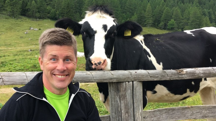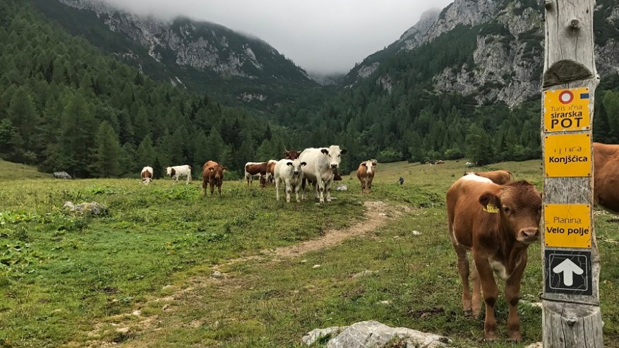Do izhodišča se peljete mimo športnega centra na Pokljuki in zavijete na makadamsko cesto proti Uskovnici. Ko pripeljete do križišča, zavijete desno in peljete povsem do konca ceste. Običajno je že manjše parkirišče polno zgodaj zjutraj, zato lahko avto pustite tudi ob cesti. Tudi pri nama je bilo tako, saj je bilo obiskovalcev Triglava res precej. Midva sva avtomobil parkirala ob 8.30 zjutraj in jo mahnila proti planini Konjščica. Rahel vzpon po gozdni poti in kmalu pridete na čudovito planino, kjer se celo poletje pase večje število krav. Pri koči sva si privoščila zajtrk, družbo pa so nama delale simpatične krave. Vreme naju je presenetilo, saj je bila napoved res sončna, a pričakala naju je nizka in gosta oblačnost.
