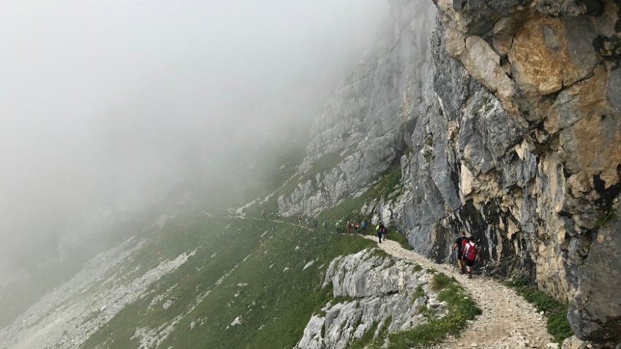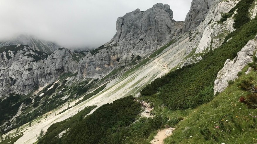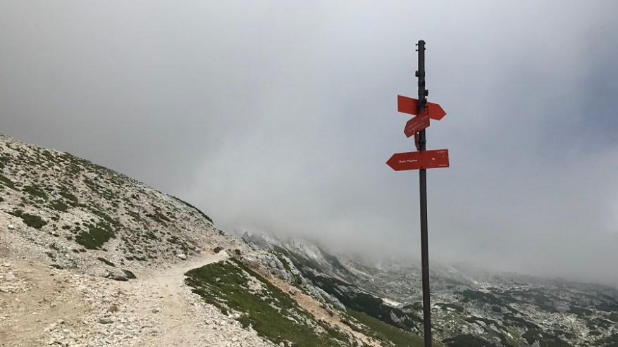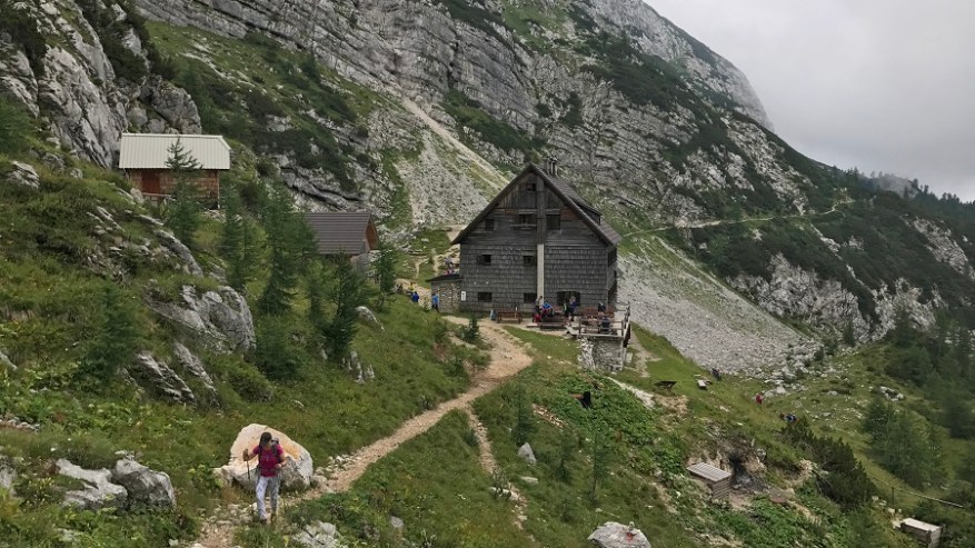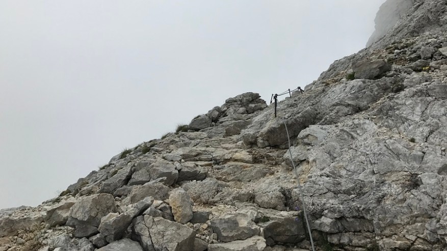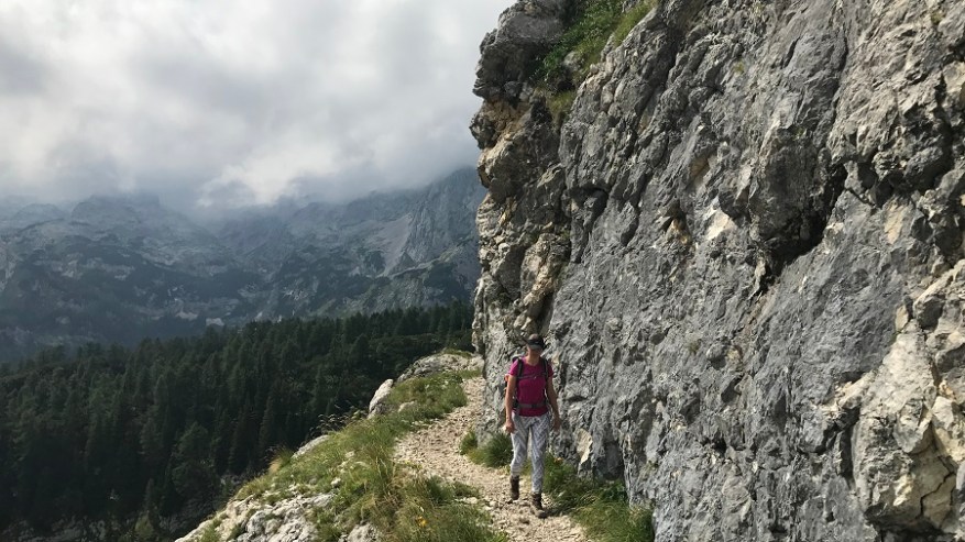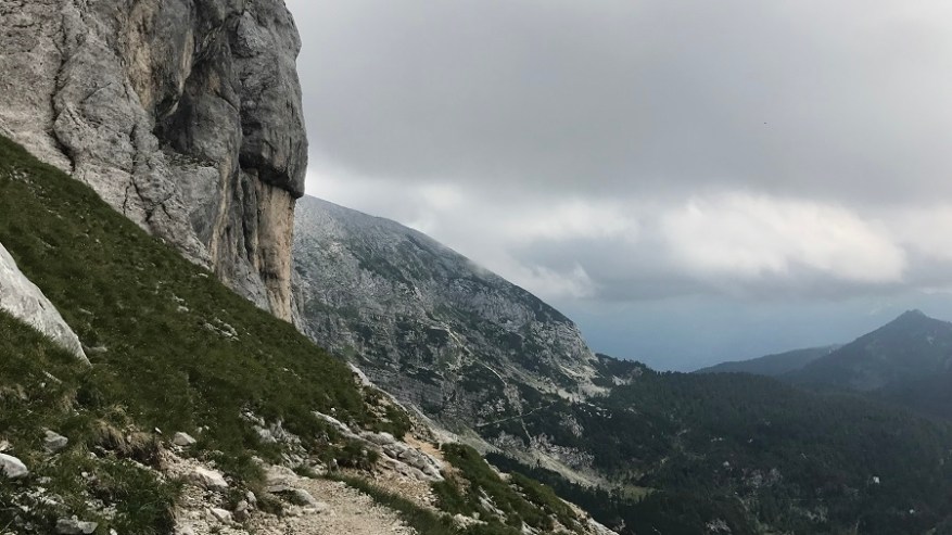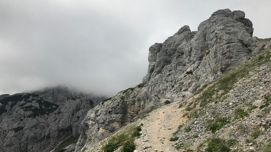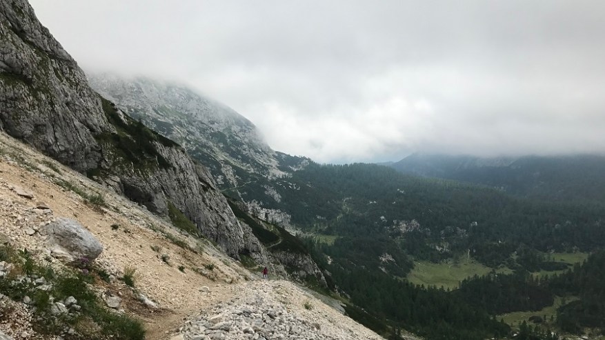 Od tu naprej poteka celotna pot do Vodnikovega doma skoraj po ravnem terenu oziroma celo malenkost navzdol, tako da vam omogoča hiter in lahek korak. Ves čas hodite ob steni in ob jasnem vremenu lahko občudujete lepote bohinjske doline. Midva sva lahko občudovala le pot in tu in tam kakšen mini pogled v dolino. Tik pred Vodnikovim domom sva ujela eno večjo skupino, ki so jo mahnili na dvo-dnevni Triglav, sicer pa sva imela ves čas prazno pot. Na Vodnikovem domu je bila res gneča. Midva sva se hitro odločila, da jo mahneva še naprej proti domu na Planiki, ki je povsem pod Triglavom. Ostali so si privoščili dolgo malico, midva pa le Frutabelo in gasa naprej. Razgleda še vedno skoraj nič.