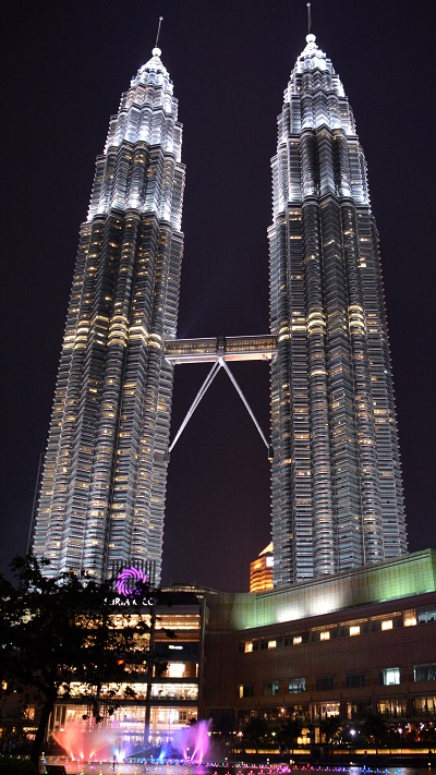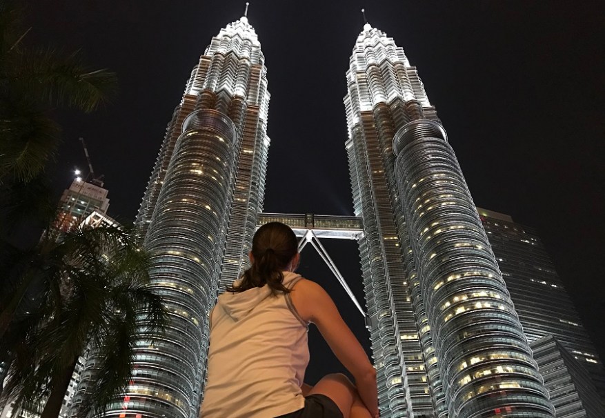 Za prvi dan v Kuala Lumpurju sva si želela videti le bleščeča dvojčka Petronas Towers v centru mesta. Kuala Lumpur ima pravo tropsko podnebje z 90% vlago in res visokimi temperaturami (okrog 40 st. Celzija). Na soncu je temperatura ozračja še višja, zato je res potrebna previdnost. Kosilo sva si privoščila kar v sosednjem ogromnem nakupovalnem centru Sunway Putra Mall, ki je pravo mesto v mestu. In seveda je klimatiziran, kar privablja tako domačine kot tudi turiste v najbolj vročih urah. Okrog štirih sva se sprehodila proti dvojčkoma, a naju je na poti presenetila strašna tropska nevihta, ki pa je na koncu trajala kar 3 ure. Obtičala sva v enem manjšem hodniku stanovanja in strmela v dež, ki je padal kot iz škafa. Ulice so bile poplavljene in promet se je dobesedno ustavil. Dež nama vseeno ni čisto prekrižal načrtov, saj je po sedmi zvečer ponehal. Ko sva stopila iz metroja pred dvojčka Petronas Towers, sva se zazrla v nebo in zagledala zagotovo najlepšo stavbo na svetu. Dvojčka Petronas Towers sta osupljivo bleščeča in prekrasna. Zame zagotovo najlepša na svetu.